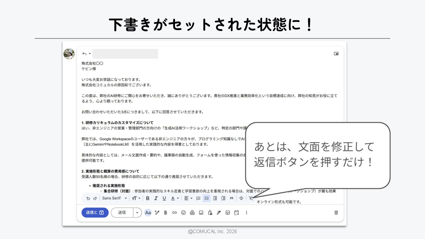 @COMUCAL Inc. 2026 下書きがセットされた状態に! あとは、⽂⾯を修正して 返信ボタンを押すだけ!