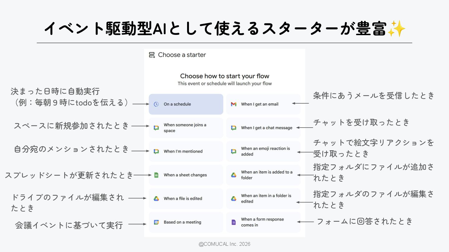 @COMUCAL Inc. 2026 イベント駆動型AIとして使えるスターターが豊富✨ 決まった日時に自動実行 (例:毎朝9時にtodoを伝える) 条件にあうメールを受信したとき スペースに新規参加されたとき 自分宛のメンションされたとき スプレッドシートが更新されたとき