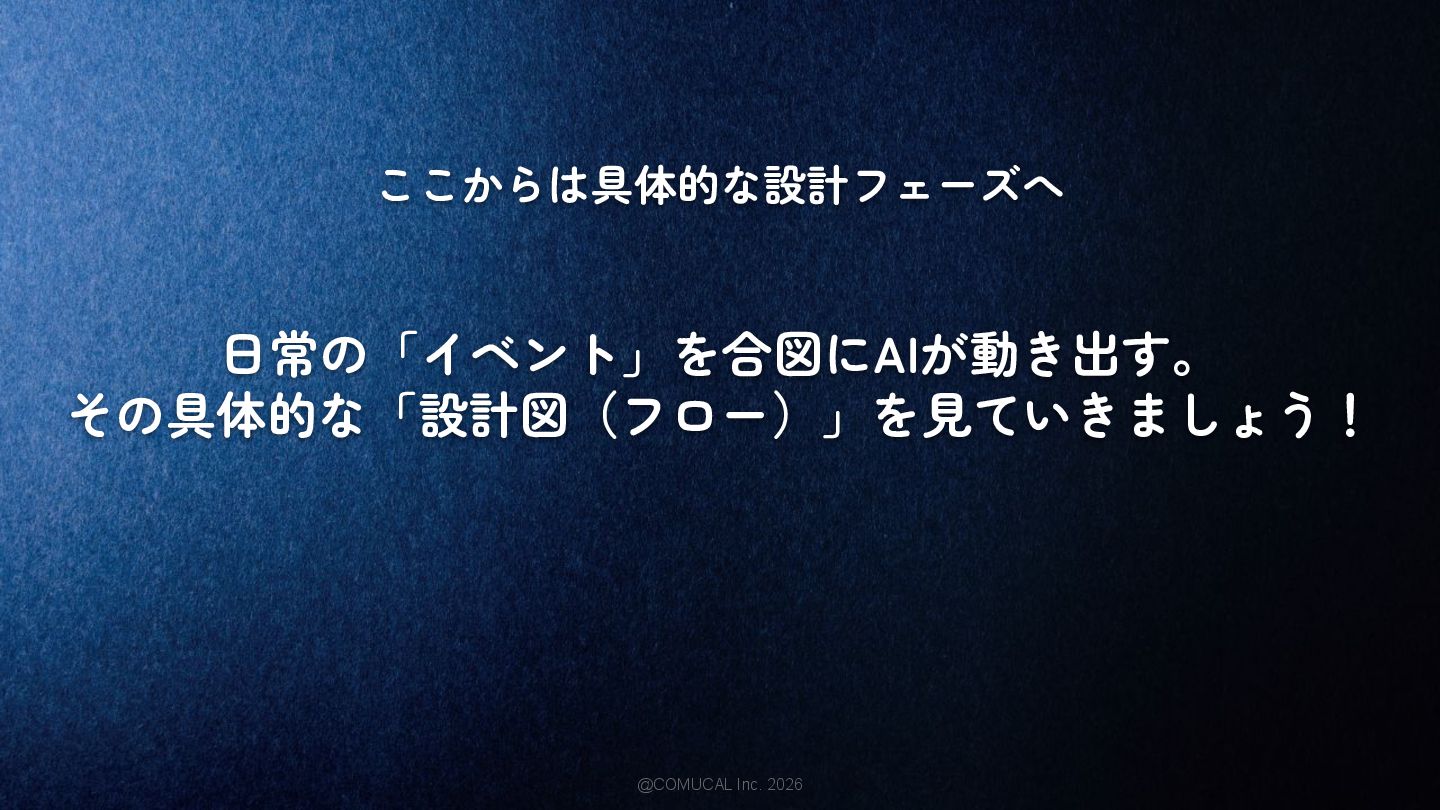 @COMUCAL Inc. 2026 日常の「イベント」を合図にAIが動き出す。 その具体的な「設計図(フロー)」を見ていきましょう! ここからは具体的な設計フェーズへ