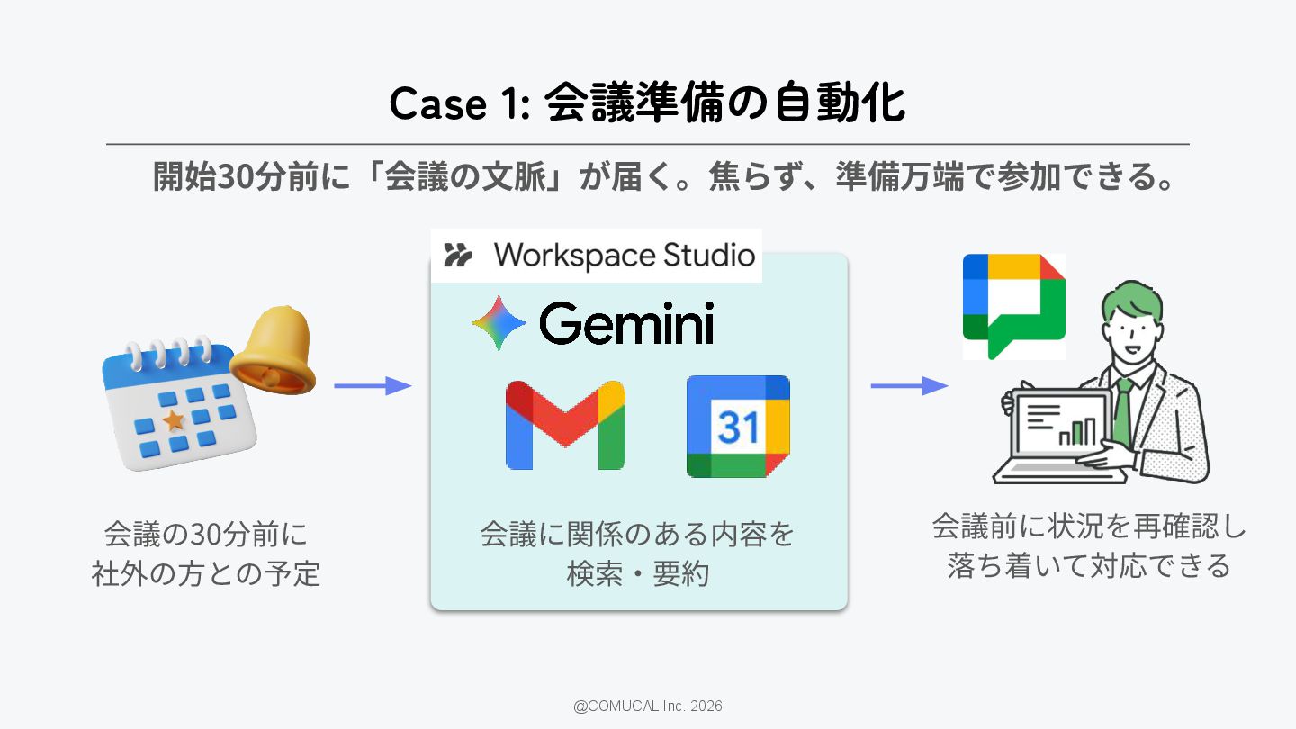 @COMUCAL Inc. 2026 Case 1: 会議準備の自動化 開始30分前に「会議の⽂脈」が届く。焦らず、準備万端で参加できる。 会議の30分前に 社外の⽅との予定 会議に関係のある内容を