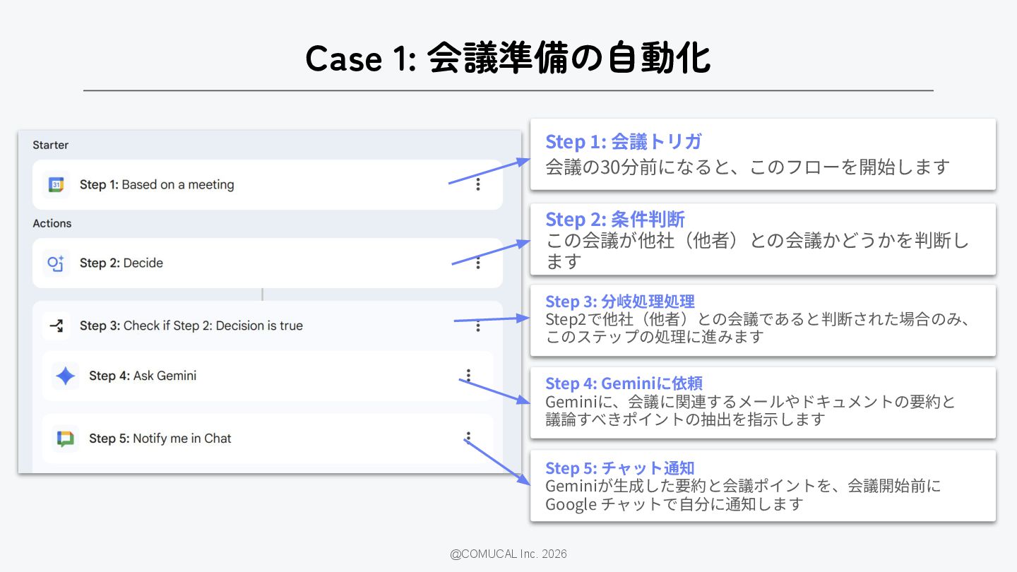 @COMUCAL Inc. 2026 Case 1: 会議準備の自動化 Step 1: 会議トリガ 会議の30分前になると、このフローを開始します