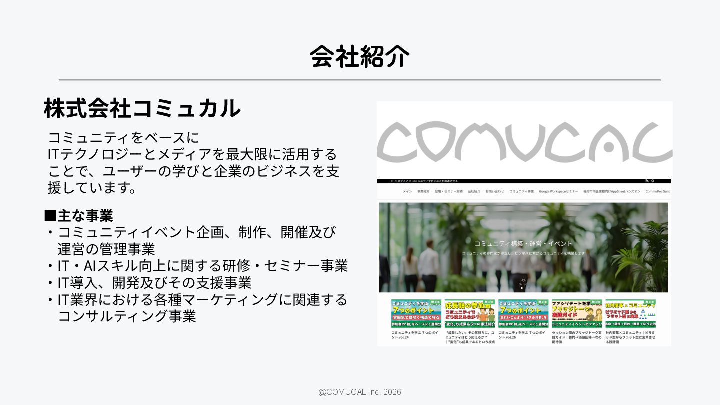 @COMUCAL Inc. 2026 会社紹介 株式会社コミュカル ▪主な事業 ‧コミュニティイベント企画、制作、開催及び 運営の管理事業 ‧IT‧AIスキル向上に関する研修‧セミナー事業 ‧IT導⼊、開発及びその⽀援事業