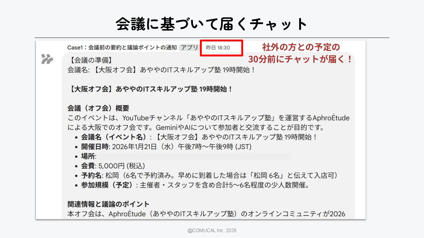 @COMUCAL Inc. 2026 会議に基づいて届くチャット 社外の⽅との予定の 30分前にチャットが届く!