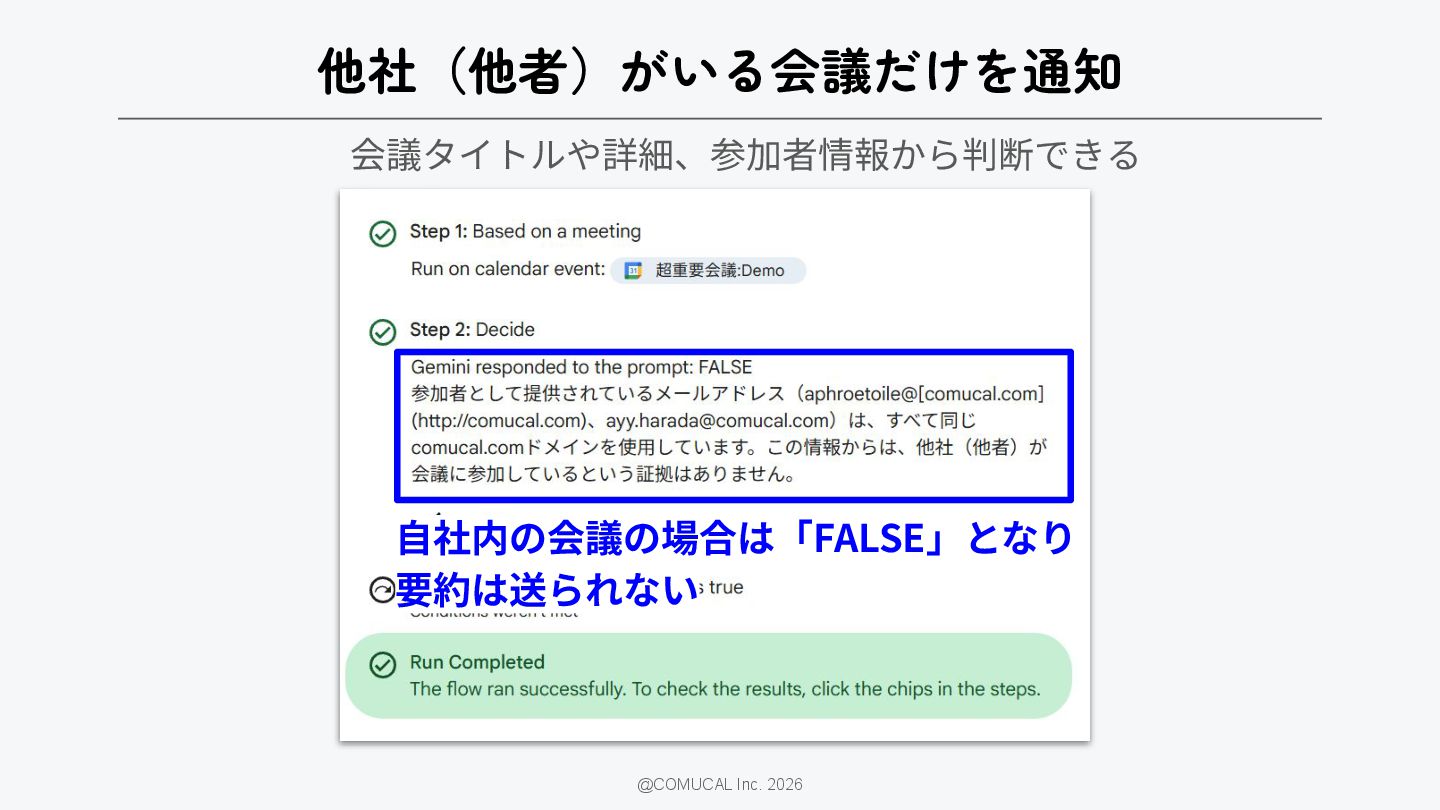 @COMUCAL Inc. 2026 他社(他者)がいる会議だけを通知 会議タイトルや詳細、参加者情報から判断できる ⾃社内の会議の場合は「FALSE」となり 要約は送られない