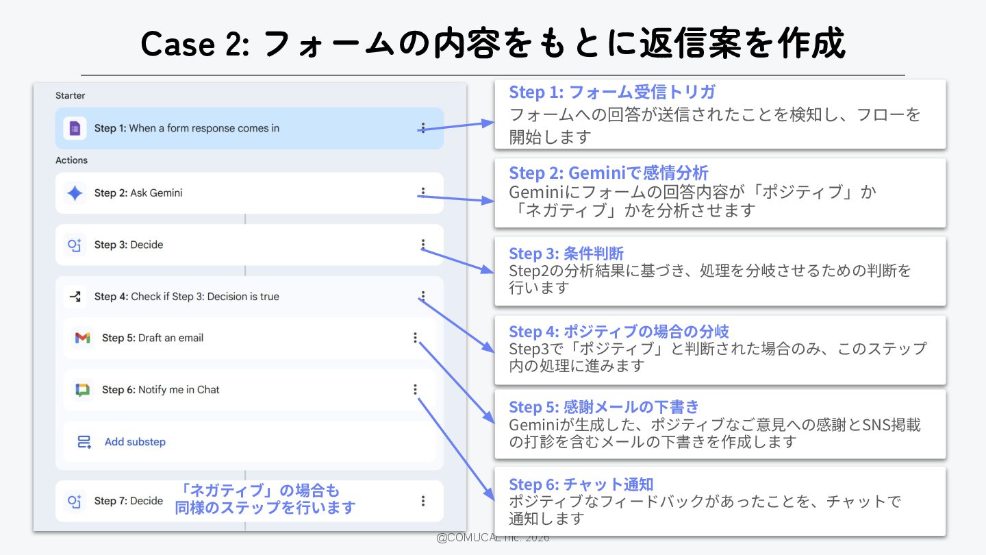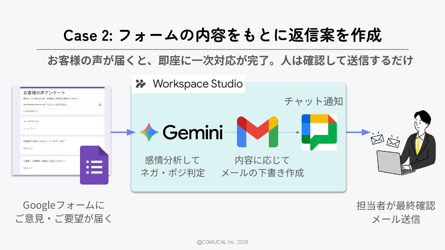 @COMUCAL Inc. 2026 Case 2: フォームの内容をもとに返信案を作成 Googleフォームに ご意⾒‧ご要望が届く チャット通知 担当者が最終確認