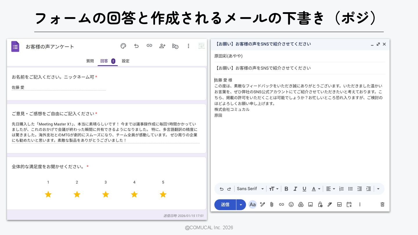 @COMUCAL Inc. 2026 フォームの回答と作成されるメールの下書き(ポジ)