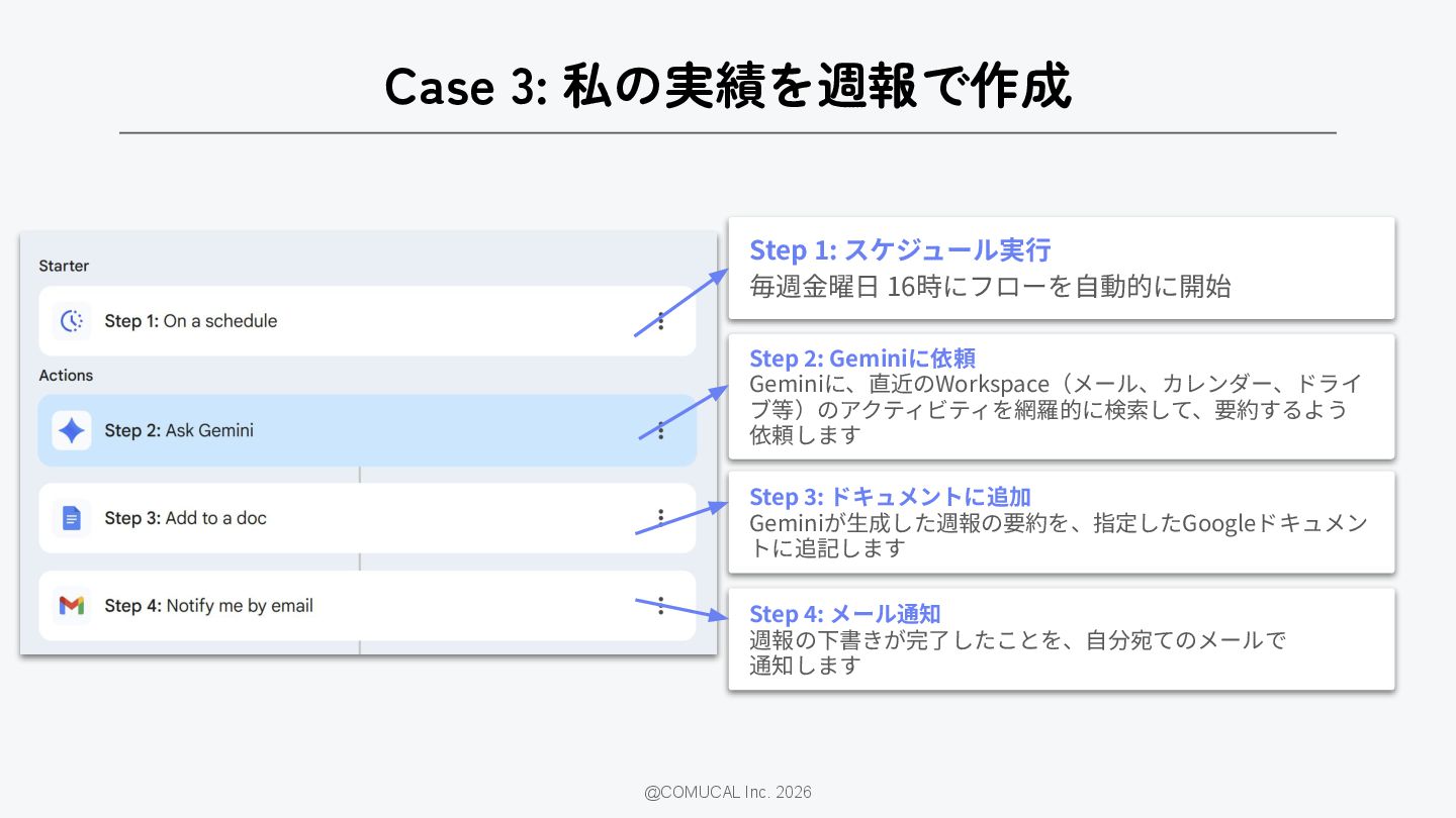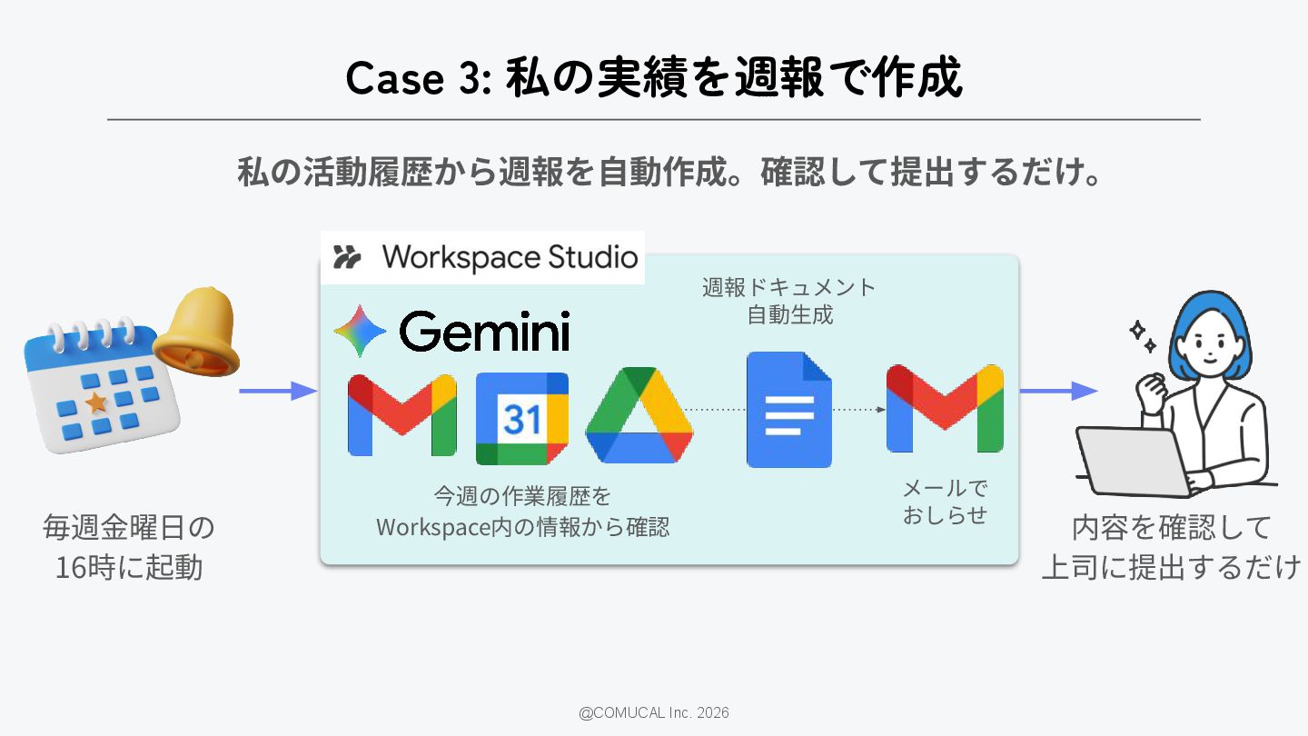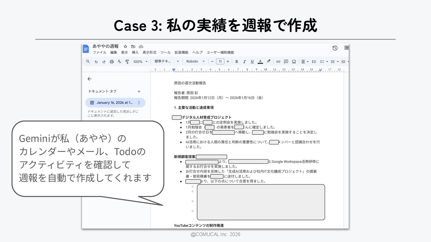 @COMUCAL Inc. 2026 Case 3: 私の実績を週報で作成 Geminiが私(あやや)の カレンダーやメール、Todoの アクティビティを確認して 週報を⾃動で作成してくれます