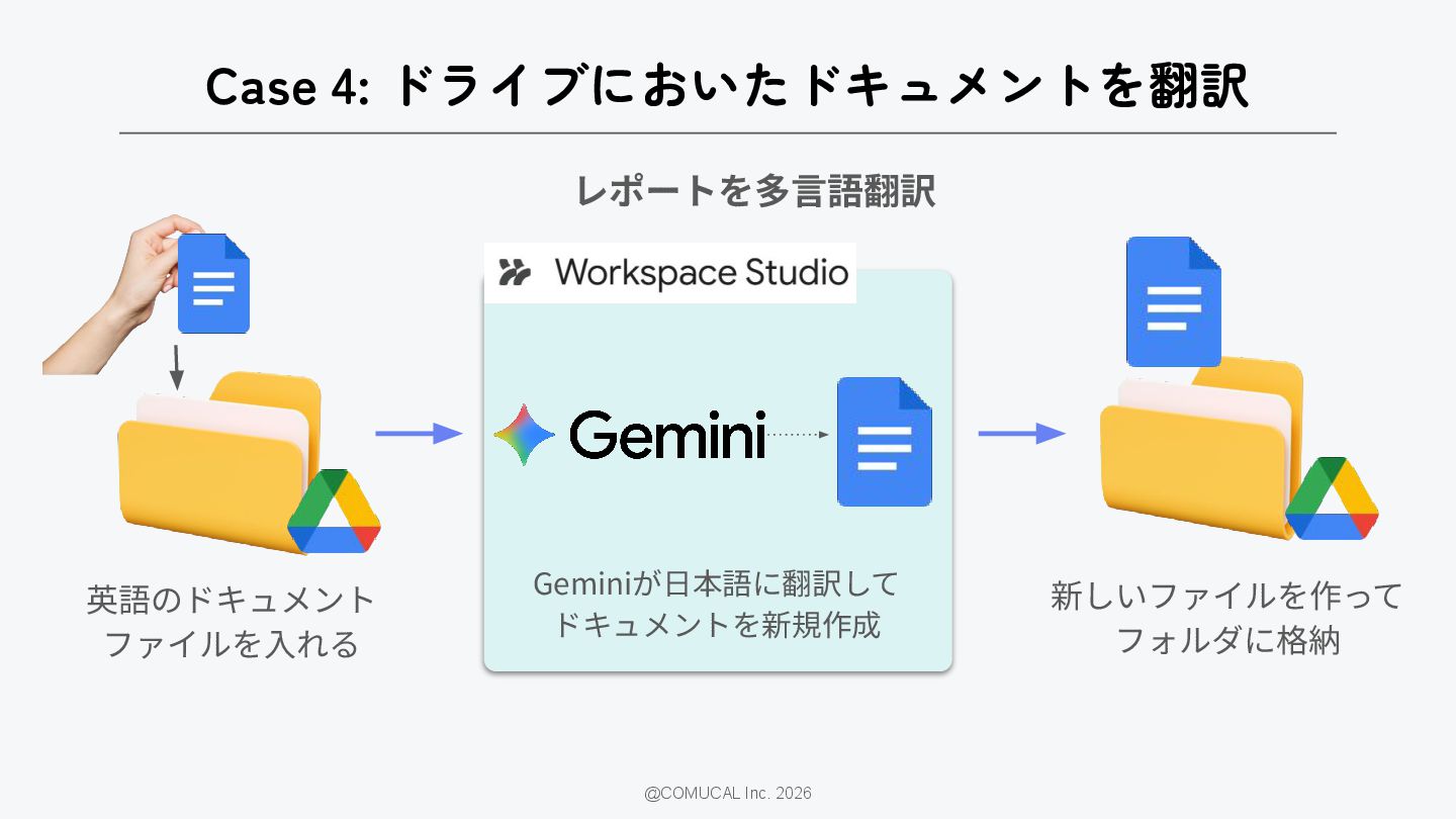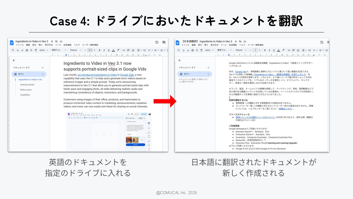 @COMUCAL Inc. 2026 Case 4: ドライブにおいたドキュメントを翻訳 英語のドキュメント ファイルを⼊れる Geminiが⽇本語に翻訳して ドキュメントを新規作成