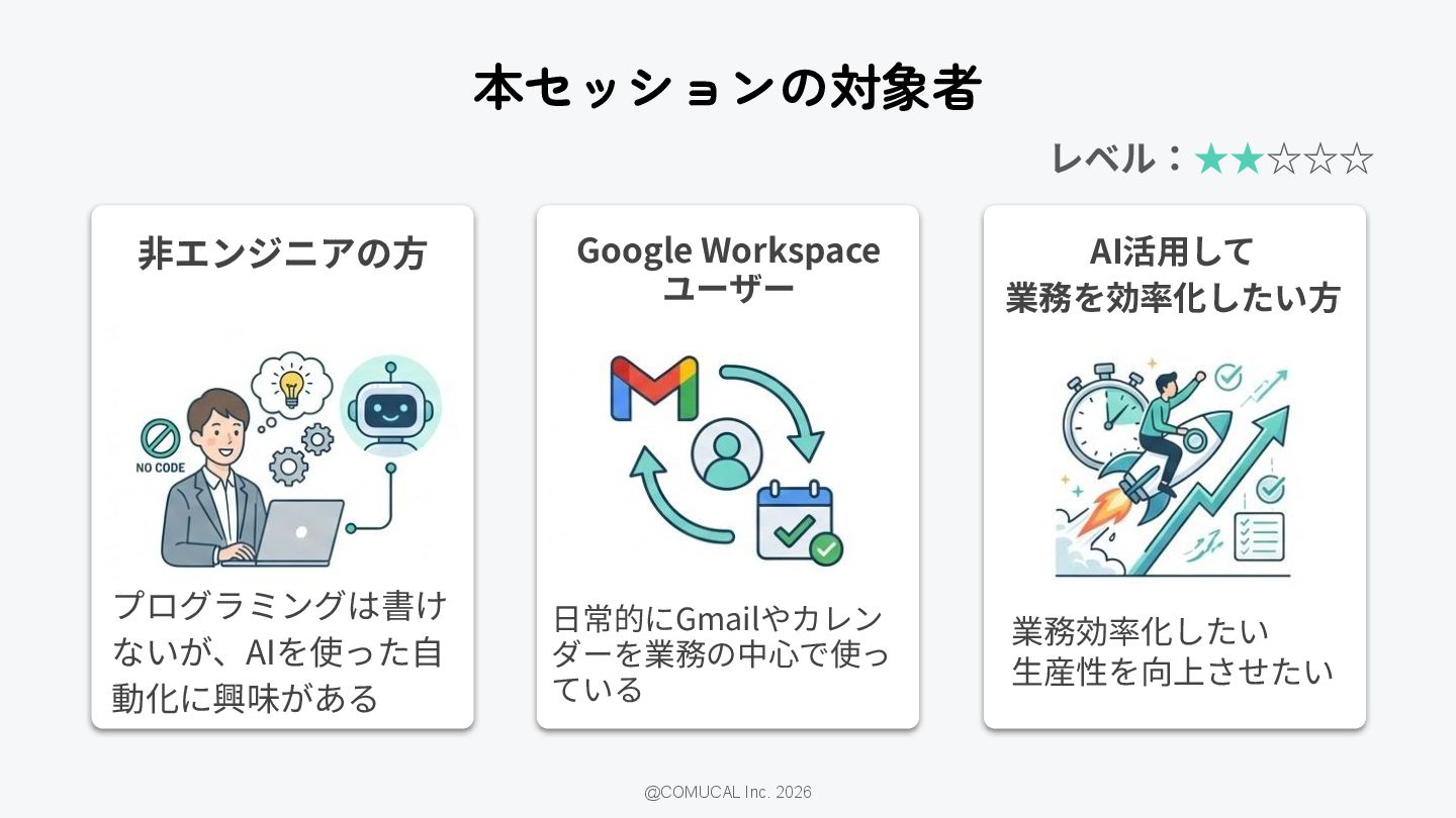 @COMUCAL Inc. 2026 本セッションの対象者 レベル:★★☆☆☆ ⾮エンジニアの⽅ Google Workspace ユーザー AI活⽤して
