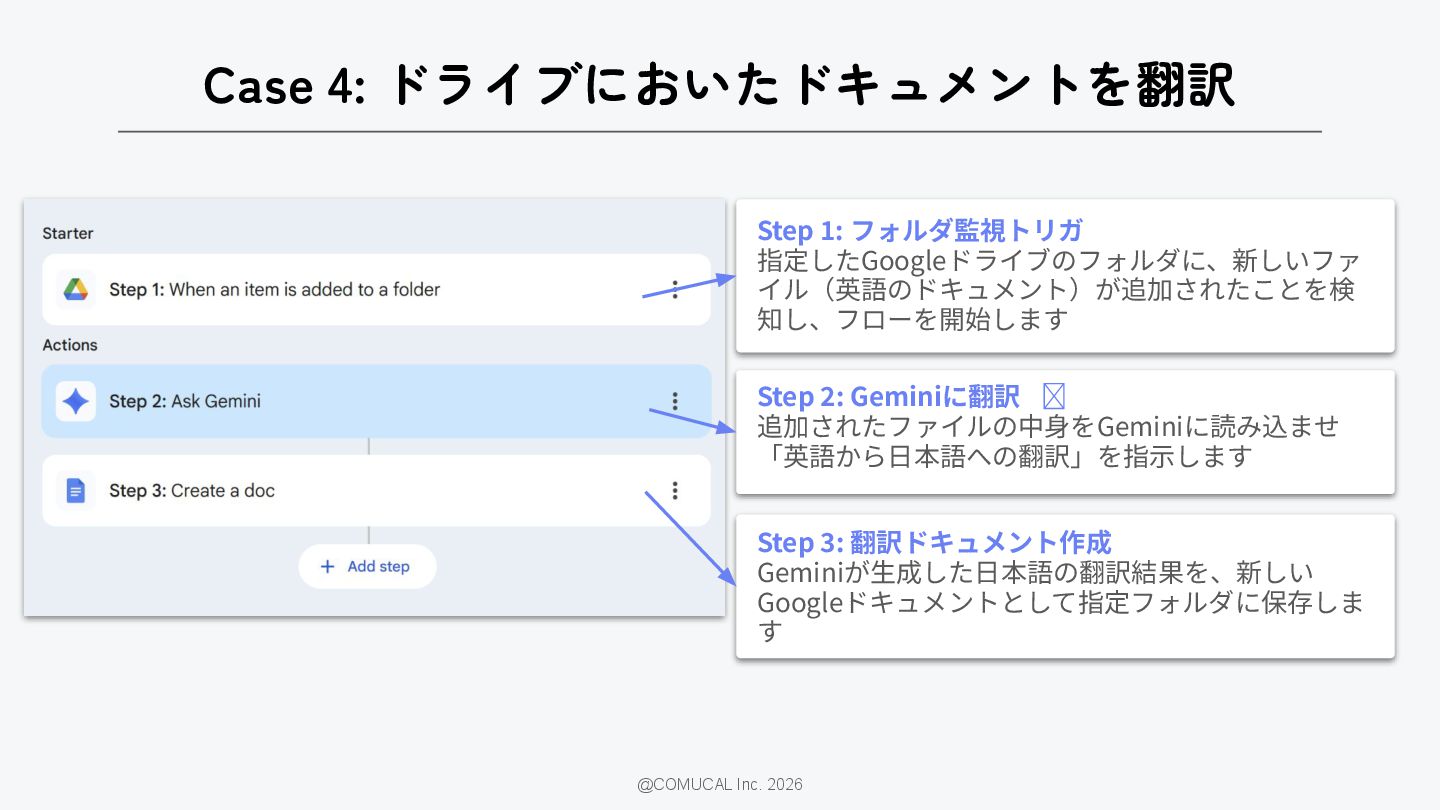 @COMUCAL Inc. 2026 Case 4: ドライブにおいたドキュメントを翻訳 Step 1: フォルダ監視トリガ 指定したGoogleドライブのフォルダに、新しいファ