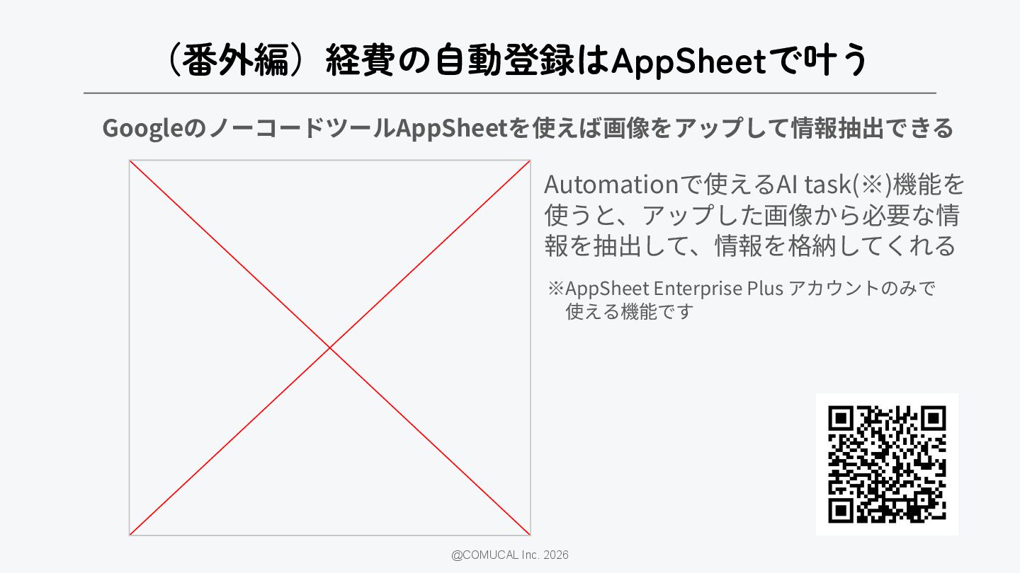 @COMUCAL Inc. 2026 (番外編)経費の自動登録はAppSheetで叶う GoogleのノーコードツールAppSheetを使えば画像をアップして情報抽出できる ※AppSheet Enterprise Plus アカウントのみで 使える機能です
