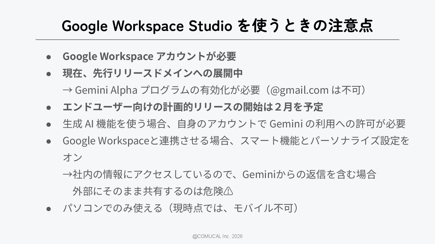 @COMUCAL Inc. 2026 Google Workspace Studio を使うときの注意点 • Google Workspace