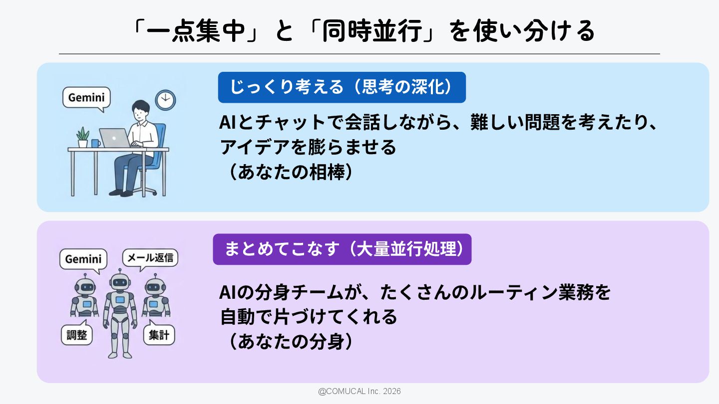 @COMUCAL Inc. 2026 「一点集中」と「同時並行」を使い分ける AIとチャットで会話しながら、難しい問題を考えたり、 アイデアを膨らませる (あなたの相棒) AIの分⾝チームが、たくさんのルーティン業務を ⾃動で⽚づけてくれる (あなたの分⾝)