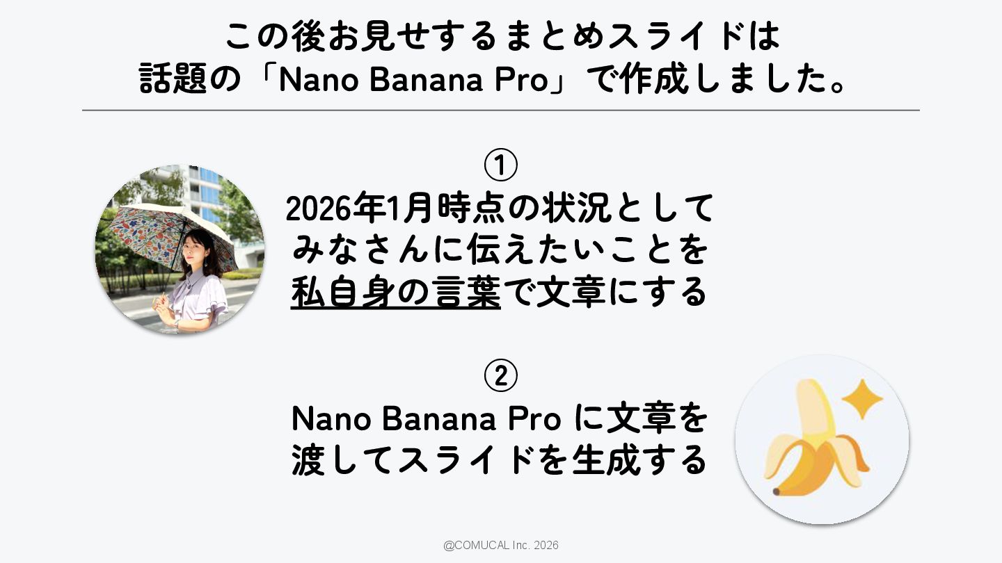 @COMUCAL Inc. 2026 この後お見せするまとめスライドは 話題の「Nano Banana Pro」で作成しました。 ① 2026年1月時点の状況として みなさんに伝えたいことを