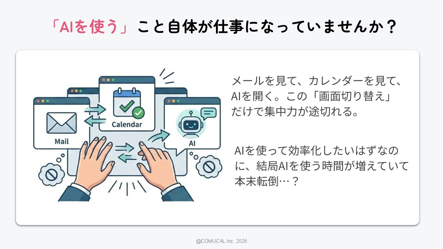 @COMUCAL Inc. 2026 「AIを使う」こと自体が仕事になっていませんか? AIを使って効率化したいはずなの に、結局AIを使う時間が増えていて 本末転倒…? メールを⾒て、カレンダーを⾒て、 AIを開く。この「画⾯切り替え」 だけで集中⼒が途切れる。