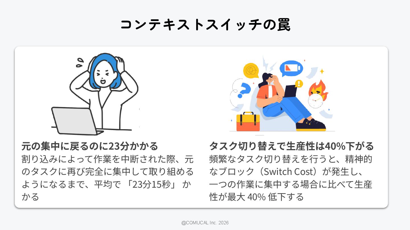@COMUCAL Inc. 2026 コンテキストスイッチの罠 タスク切り替えで⽣産性は40%下がる 頻繁なタスク切り替えを⾏うと、精神的 なブロック(Switch Cost)が発⽣し、 ⼀つの作業に集中する場合に⽐べて⽣産 性が最⼤