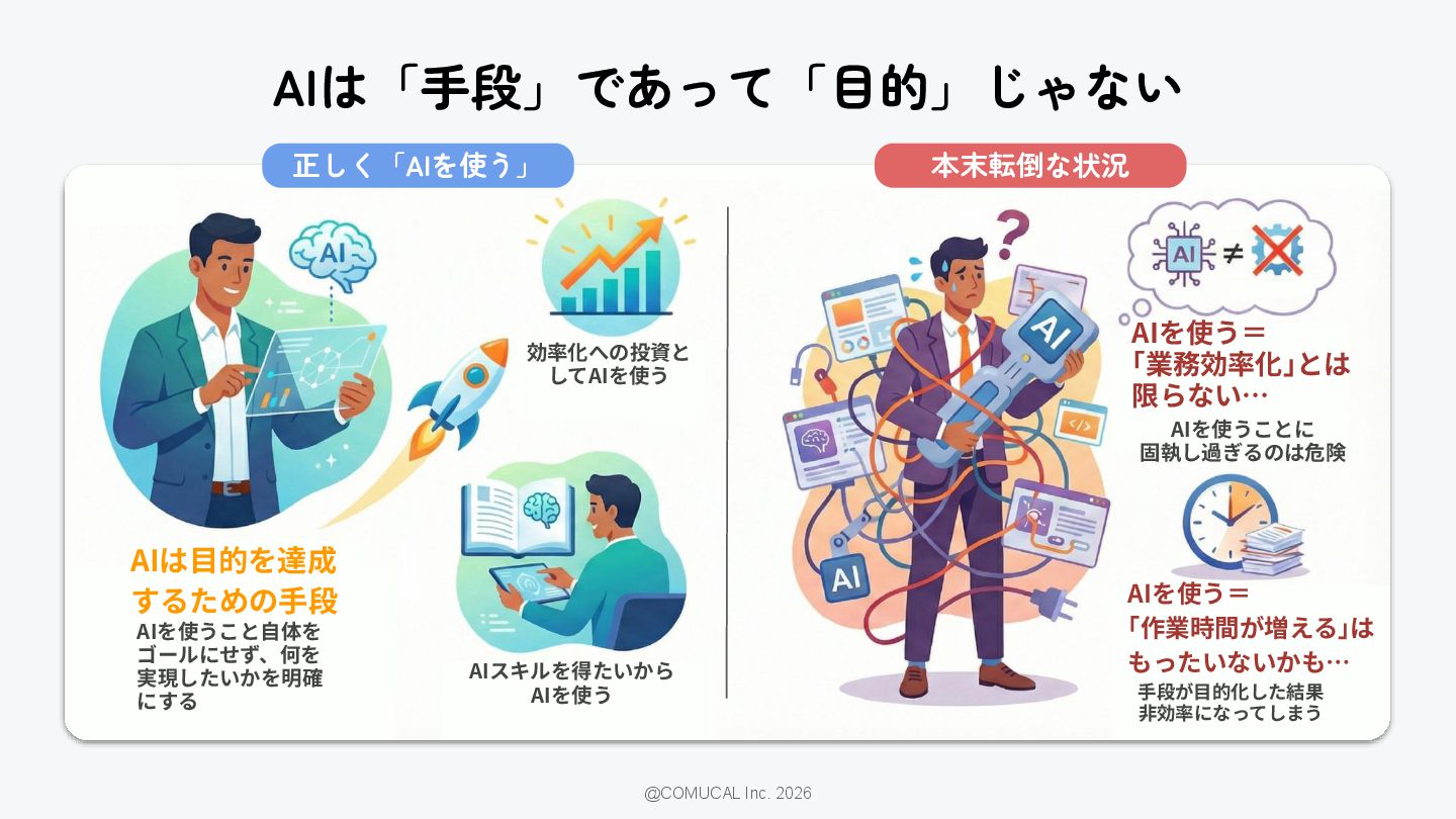@COMUCAL Inc. 2026 AIは「手段」であって「目的」じゃない 正しく「AIを使う」 本末転倒な状況 AIは⽬的を達成 するための⼿段 効率化への投資と してAIを使う