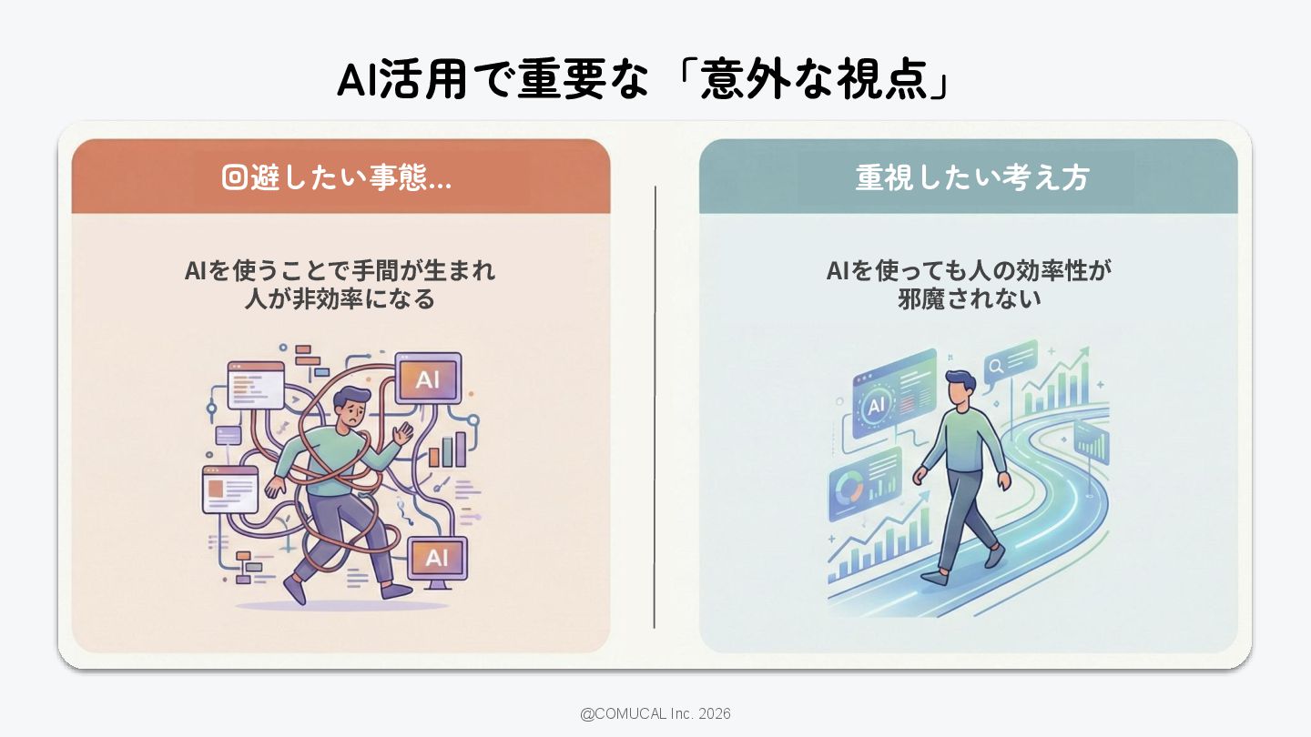 @COMUCAL Inc. 2026 AI活用で重要な「意外な視点」 回避したい事態… AIを使うことで⼿間が⽣まれ ⼈が⾮効率になる 重視したい考え方 AIを使っても⼈の効率性が 邪魔されない