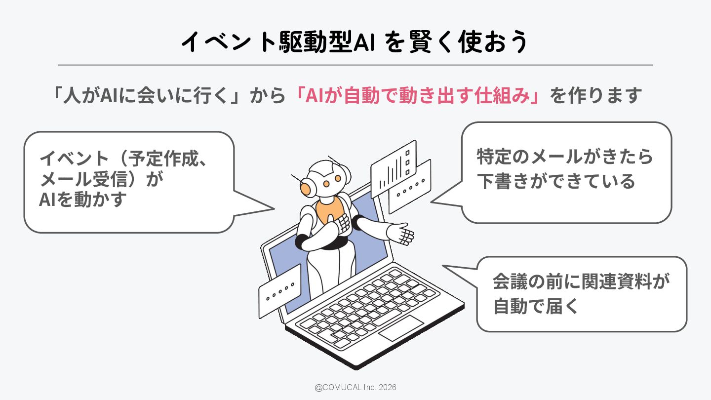 @COMUCAL Inc. 2026 イベント駆動型AI を賢く使おう 「⼈がAIに会いに⾏く」から「AIが⾃動で動き出す仕組み」を作ります 特定のメールがきたら 下書きができている 会議の前に関連資料が ⾃動で届く