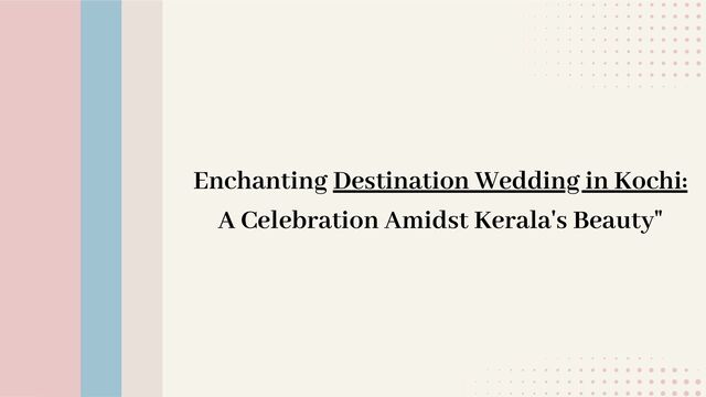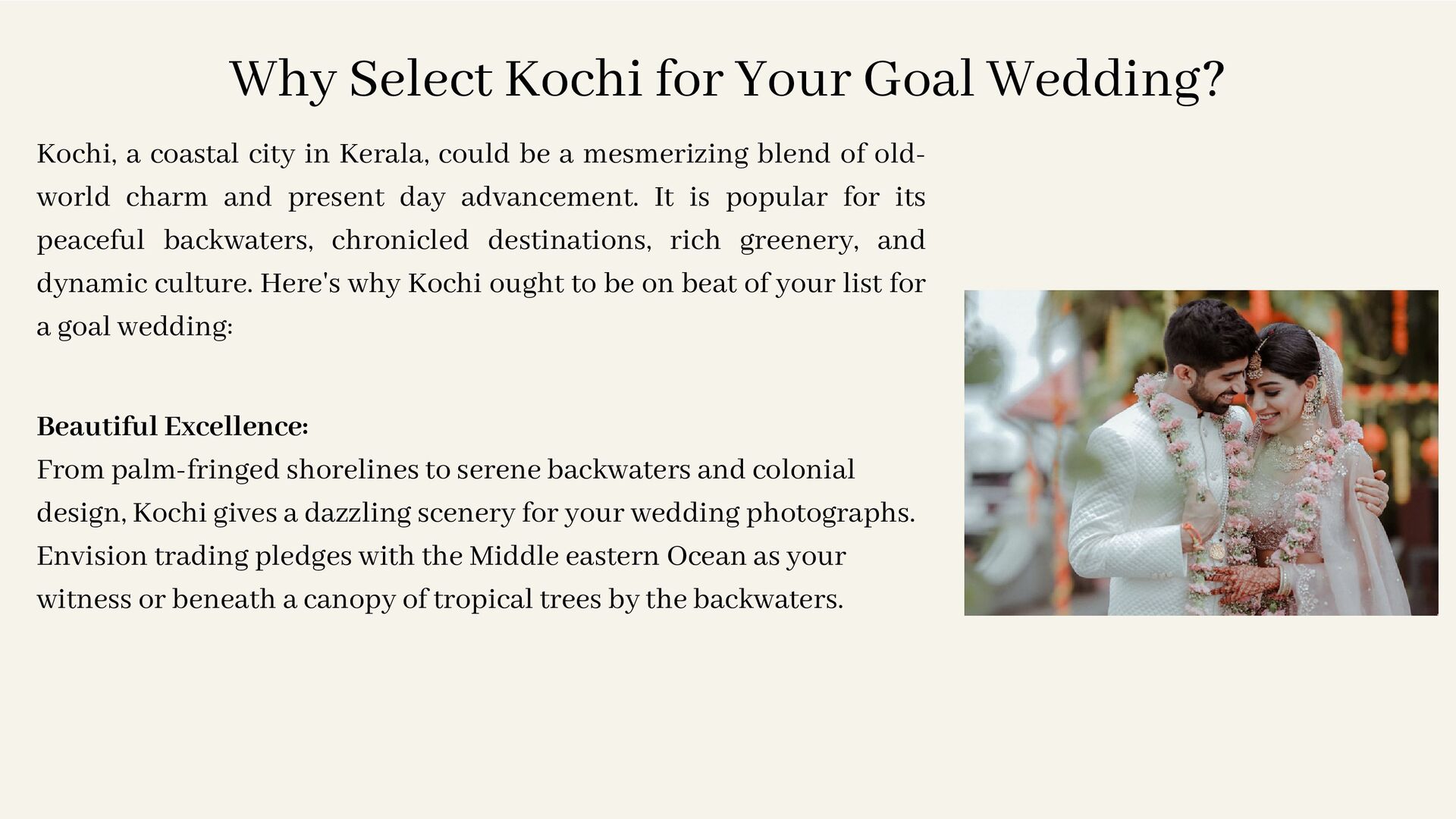 blend of old- world charm and present day advancement. It is popular for its peaceful backwaters, chronicled destinations, rich greenery, and dynamic culture. Here's why Kochi ought to be on beat of your list for a goal wedding: Why Select Kochi for Your Goal Wedding? Beautiful Excellence: From palm-fringed shorelines to serene backwaters and colonial design, Kochi gives a dazzling scenery for your wedding photographs. Envision trading pledges with the Middle eastern Ocean as your witness or beneath a canopy of tropical trees by the backwaters.