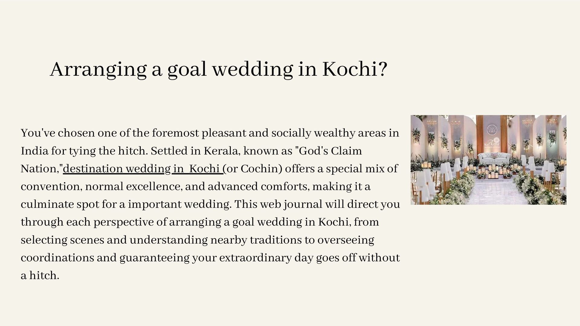 areas in India for tying the hitch. Settled in Kerala, known as "God's Claim Nation,"destination wedding in Kochi (or Cochin) offers a special mix of convention, normal excellence, and advanced comforts, making it a culminate spot for a important wedding. This web journal will direct you through each perspective of arranging a goal wedding in Kochi, from selecting scenes and understanding nearby traditions to overseeing coordinations and guaranteeing your extraordinary day goes off without a hitch. Arranging a goal wedding in Kochi?