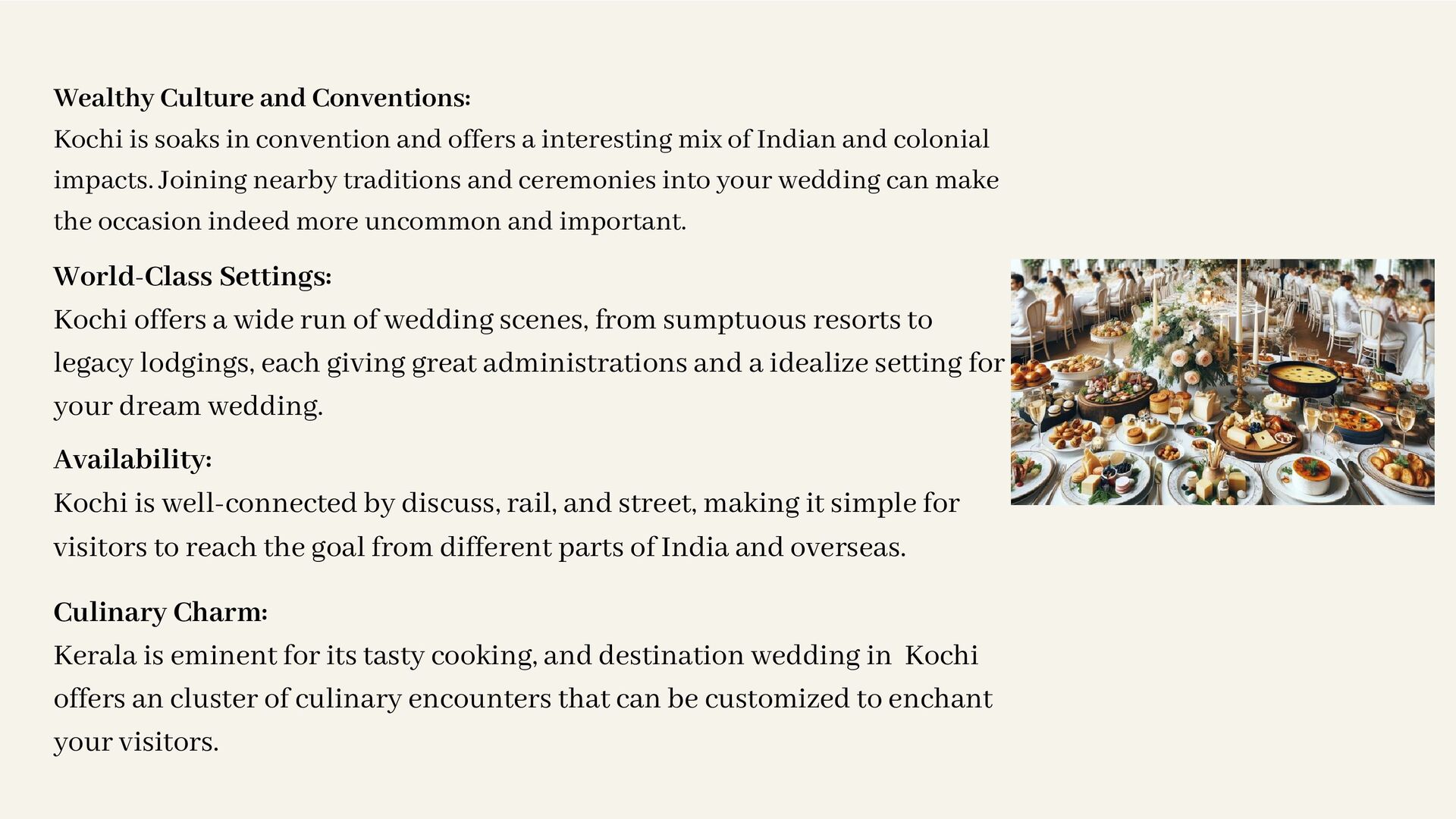 from sumptuous resorts to legacy lodgings, each giving great administrations and a idealize setting for your dream wedding. Availability: Kochi is well-connected by discuss, rail, and street, making it simple for visitors to reach the goal from different parts of India and overseas. Culinary Charm: Kerala is eminent for its tasty cooking, and destination wedding in Kochi offers an cluster of culinary encounters that can be customized to enchant your visitors. Wealthy Culture and Conventions: Kochi is soaks in convention and offers a interesting mix of Indian and colonial impacts. Joining nearby traditions and ceremonies into your wedding can make the occasion indeed more uncommon and important.