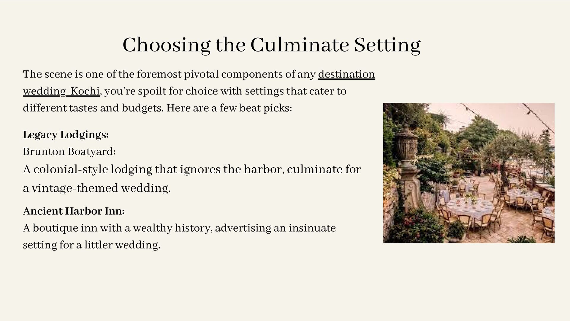 any destination wedding Kochi, you're spoilt for choice with settings that cater to different tastes and budgets. Here are a few beat picks: Choosing the Culminate Setting Legacy Lodgings: Brunton Boatyard: A colonial-style lodging that ignores the harbor, culminate for a vintage-themed wedding. Ancient Harbor Inn: A boutique inn with a wealthy history, advertising an insinuate setting for a littler wedding.