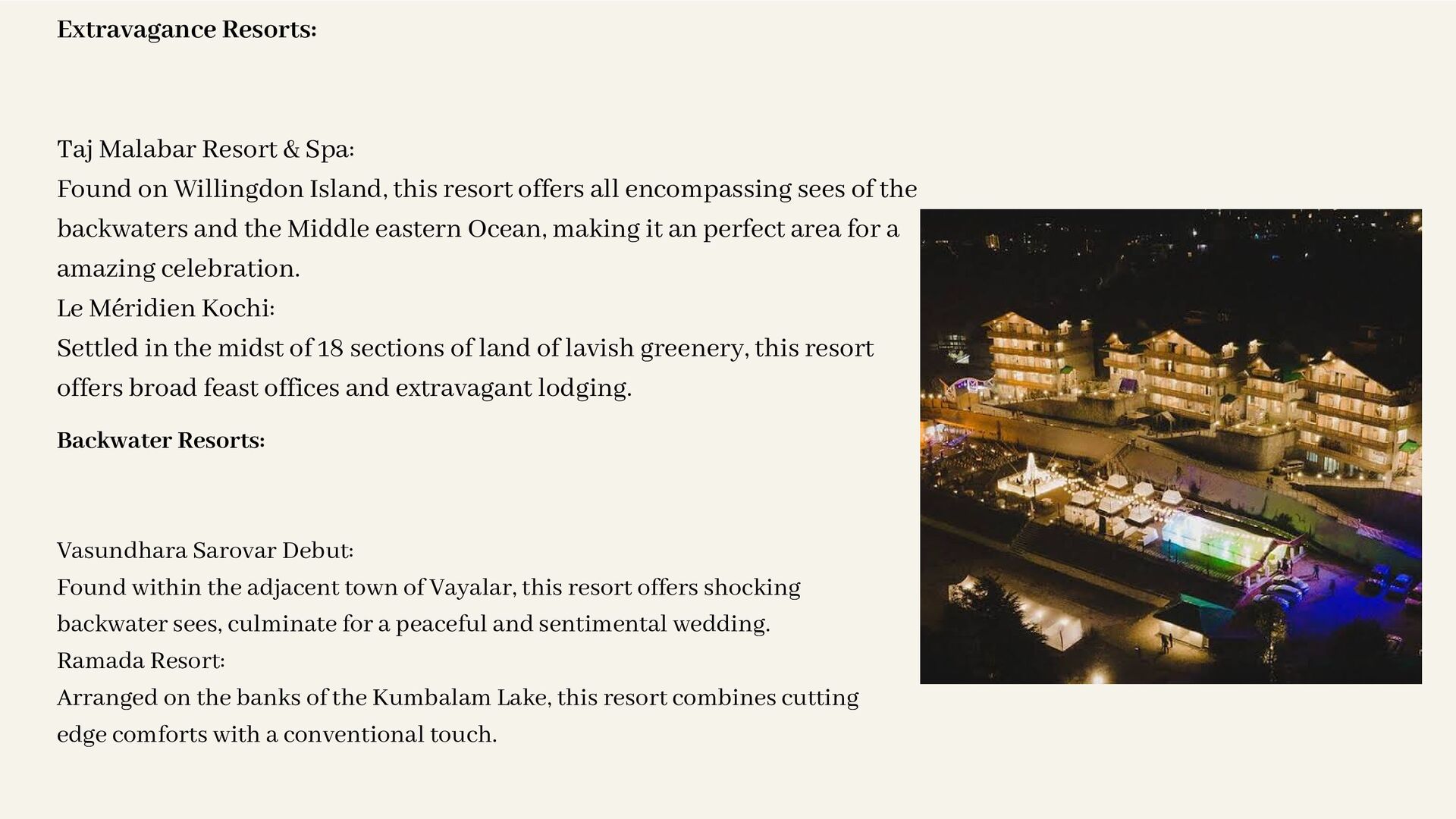 Island, this resort offers all encompassing sees of the backwaters and the Middle eastern Ocean, making it an perfect area for a amazing celebration. Le Méridien Kochi: Settled in the midst of 18 sections of land of lavish greenery, this resort offers broad feast offices and extravagant lodging. Backwater Resorts: Vasundhara Sarovar Debut: Found within the adjacent town of Vayalar, this resort offers shocking backwater sees, culminate for a peaceful and sentimental wedding. Ramada Resort: Arranged on the banks of the Kumbalam Lake, this resort combines cutting edge comforts with a conventional touch.