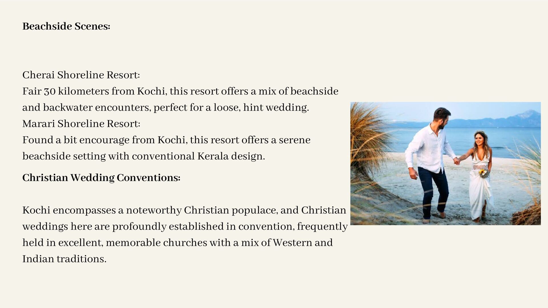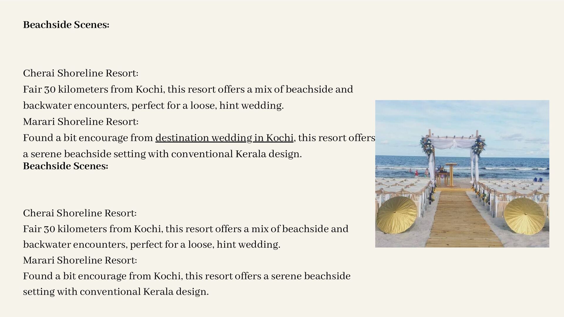 this resort offers a mix of beachside and backwater encounters, perfect for a loose, hint wedding. Marari Shoreline Resort: Found a bit encourage from destination wedding in Kochi, this resort offers a serene beachside setting with conventional Kerala design. Beachside Scenes: Cherai Shoreline Resort: Fair 30 kilometers from Kochi, this resort offers a mix of beachside and backwater encounters, perfect for a loose, hint wedding. Marari Shoreline Resort: Found a bit encourage from Kochi, this resort offers a serene beachside setting with conventional Kerala design.
