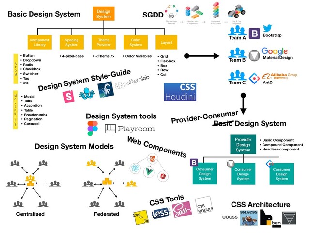 Layout • Button • Dropdown • Radio • Checkbox • Switcher • Tag • etc A T O M • Modal • Tabs • Accordion • Table • Breadcrumbs • Pagination • Carousel M O L E C U L E S • 4-pixel-base • <Theme /> • Color Variables • Grid • Flex-box • Box • Row • Col Basic Design System Team A Team B Team C Basic Design System Provider-Consumer Provider Design System Consumer Design System Consumer Design System Consumer Design System • Basic Component • Compound Component • Headless component Design System Models Centralised Federated CSS Architecture CSS Tools Bootstrap Material Design AntD Design System tools Design System Style-Guide SGDD Web Components