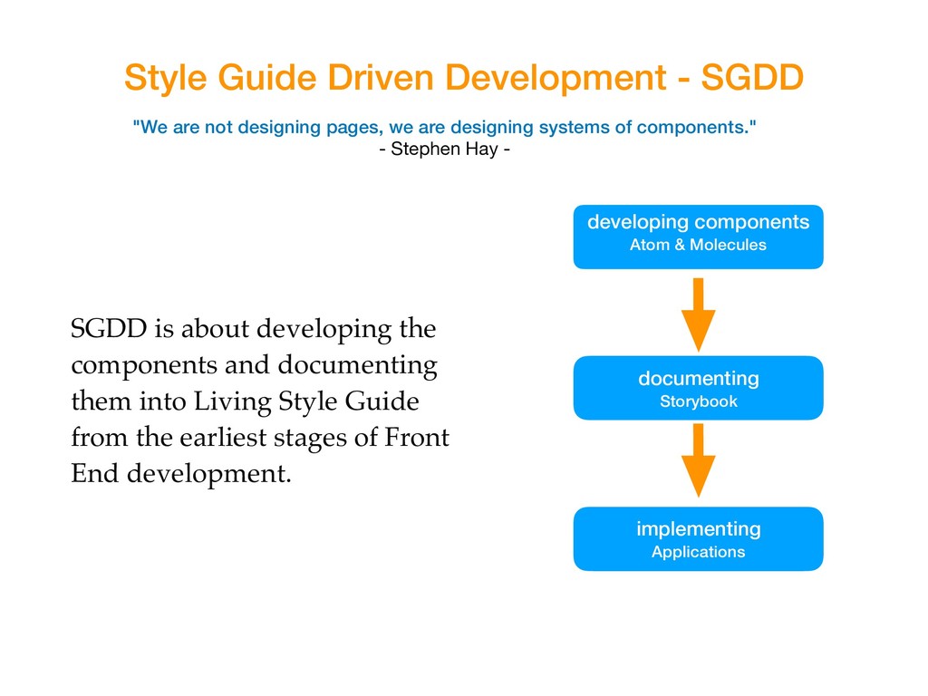 Style guide driven development starts from developing Living Style Guide from the earliest stages of development. The living style guide is a prototype that shows how user interface (UI) components will appear throughout the website or web application