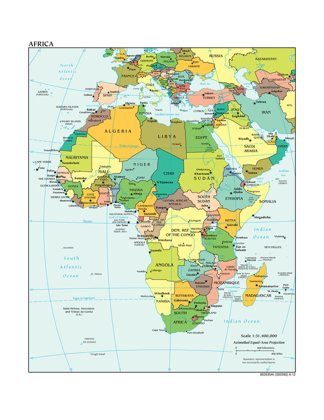 40 20 0 0 20 20 40 Tropic of Cancer 60 40 20 0 20 40 Equator Ora ng e Gulf Sea Caspian Aral Sea Zambezi Mozambique Channel I n d i a n O c e a n Niger Niger Benue Congo Nile White Nile Blue Lake Tanganyika Lake Nyasa Victoria Lake Aden Gulf of O c e a n I n d i a n Sea Arabian Gulf of Guinea O c e a n A t l a n t i c S o u t h Persian Volga Sea Red Nile Tigris Danube Sea of Azov Black Sea Mediterranean Sea N o r t h A t l a n t i c O c e a n Strait of Gibraltar Euphrates Europa Island (FRANCE) Annobón CANARY ISLANDS MADEIRA ISLANDS AZORES Reunion Zanzibar Tromelin Island Bassas da India (admin. by France, Juan de Nova Island claimed by Comoros) Mayotte Glorioso Islands AFRICA Ascension St. Helena Gough Island TRISTAN DA CUNHA KAZAKHSTAN DEM. REP. OF THE CONGO REP. OF THE CONGO Corsica Sardinia line admin. Prov. AFG. (EQUA. GUI.) (SPAIN) (PORTUGAL) (PORTUGAL) PORTUGAL SEYCHELLES Socotra Admin. boundary LIBERIA Sicily (YEMEN) (Cabinda) ANGOLA (FRANCE) (FRANCE) (FRANCE) (FRANCE) (FRANCE) OMAN YEMEN NAMIBIA BAHR. IRAQ GEO. ARM. AND. HER. BOS.& MOL. SWITZ. LUX. BEL. NETH. SLOV. CZ. REP. HUNG. MACE. SER. MONT. KOS. CRO. SLO. BULG. COMOROS ZIMBABWE MALTA TUNISIA AUS. ALB. Sahara Western MAURITIUS U.A.E CYPRUS ISRAEL JORDAN KUWAIT QATAR LEB. AZER. BELARUS ROM. UZBEKISTAN SYRIA TURKMENISTAN RUSSIA IRE. U.K. UKRAINE GREECE ITALY POLAND GERMANY FRANCE N I G E R L I B Y A S U D A N SOUTH SUDAN A L G E R I A D'IVOIRE CÔTE EQUATORIAL GUINEA BURKINA BENIN GHANA SIERRA LEONE GUINEA GUINEA-BISSAU SOMALIA ERITREA DJIBOUTI MALAWI BURUNDI RWANDA UGANDA CAMEROON SPAIN TURKEY GABON SAO TOME AND PRINCIPE NIGERIA SENEGAL THE GAMBIA CAPE VERDE REPUBLIC CENTRAL AFRICAN MAURITANIA MOROCCO SAUDI ARABIA EGYPT ETHIOPIA KENYA TANZANIA ANGOLA ZAMBIA MOZAMBIQUE MADAGASCAR SWAZILAND LESOTHO BOTSWANA SOUTH TOGO IRAN FASO CHAD MALI Saint Helena, Ascension, and Tristan da Cunha (U.K.) - Aswan Al Jizah - Cidade de Nacala Lilongwe Bujumbura Kigali Kampala Khartoum Madrid Paris Agadez Zinder Juba Toamasina Mahajanga Nouadhibou Dodoma Monrovia Yamoussoukro Abidjan Rome Lisbon Tehran Ankara Blantyre Timbuktu Al Jawf Port Sudan Walvis Bay Namibe Lubango Moundou Omdurman Hargeysa Mombasa Beira Cape Town Port Elizabeth Johannesburg Durban Kitwe Bukavu Lubumbashi Mbuji-Mayi Kisangani Pointe-Noire Douala Lagos Ibadan Ogbomoso Kano Alexandria Marrakech Casablanca Fès Constantine Oran Accra Freetown Conakry Ouagadougou Bissau Bamako Banjul Dakar Praia Nouakchott Laayoune Dar es Salaam Harare Lusaka Luanda Windhoek Gaborone Mbabane Maseru Pretoria Maputo Antananarivo Port Louis St. Denis Moroni Victoria Porto- Novo Abuja Niamey Libreville Brazzaville São Tomé Lomé Malabo Yaoundé Kinshasa Bangui N'Djamena Addis Ababa Nairobi Mogadishu Djibouti Abu Dhabi Asmara Sanaa Muscat Ashgabat Tashkent Rabat Riyadh Baghdad Amman Damascus Beirut Cairo Tripoli Algiers Tunis Athens Sofia Bucharest Belgrade Budapest Vienna Brussels London Amsterdam Prague Kyiv Minsk Warsaw Berlin Jerusalem Benghazi 800 Miles 800 Kilometers 0 0 800 Miles 800 Kilometers 0 0 803535AI (G00392) 6-12 AFRICA Boundary representation is not necessarily authoritative. Azimuthal Equal-Area Projection Scale 1:51,400,000
