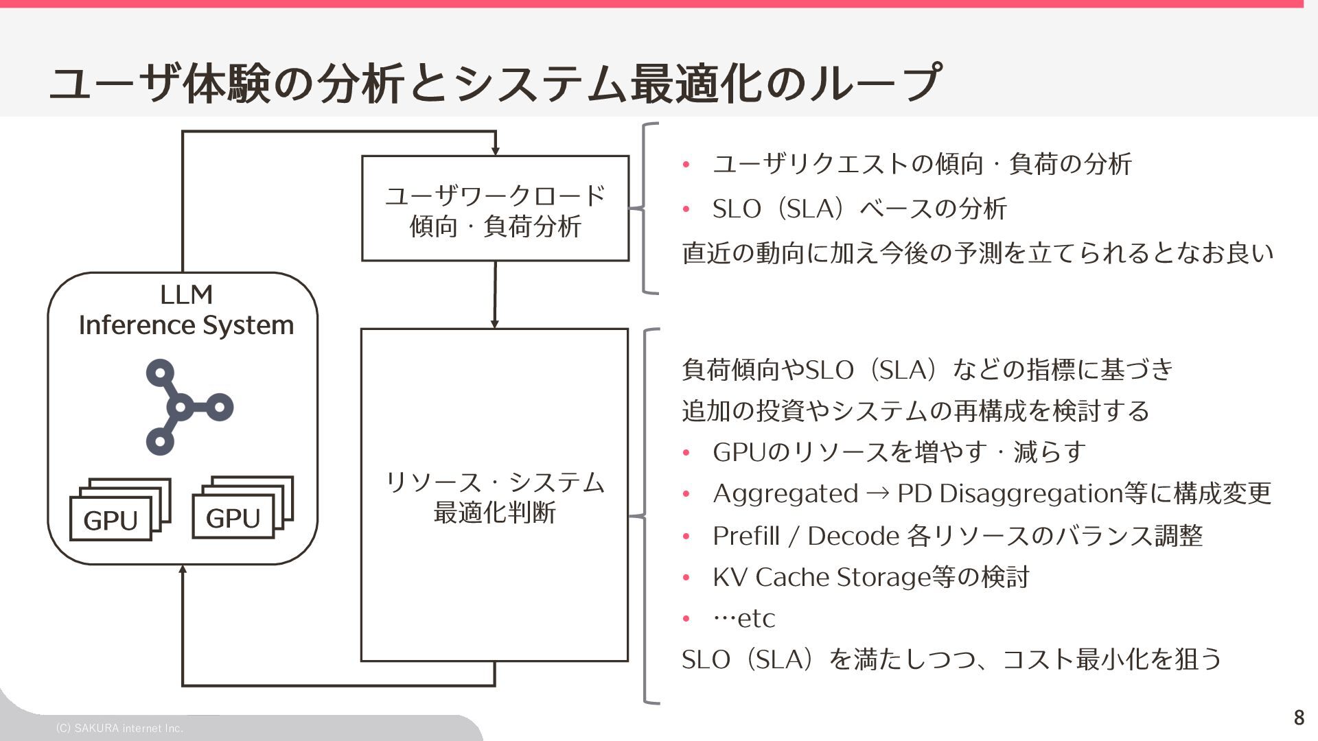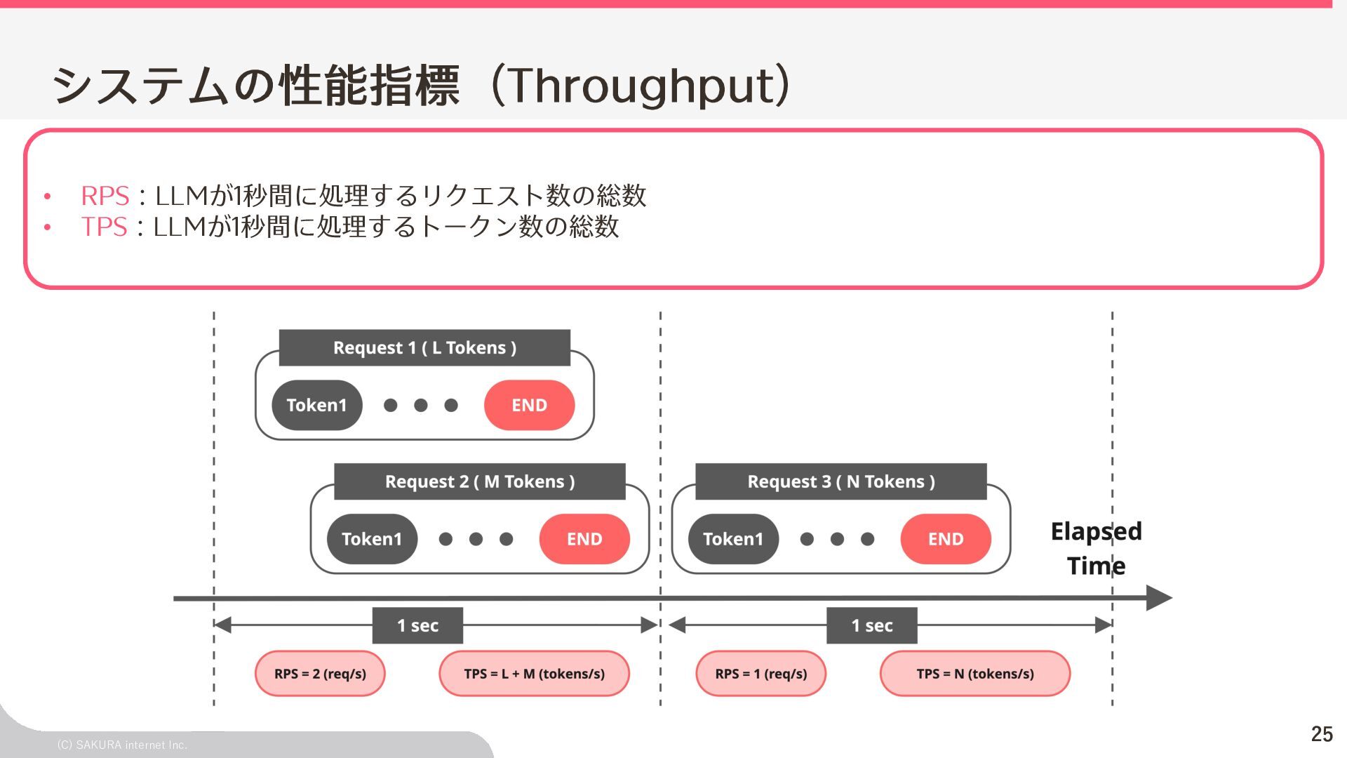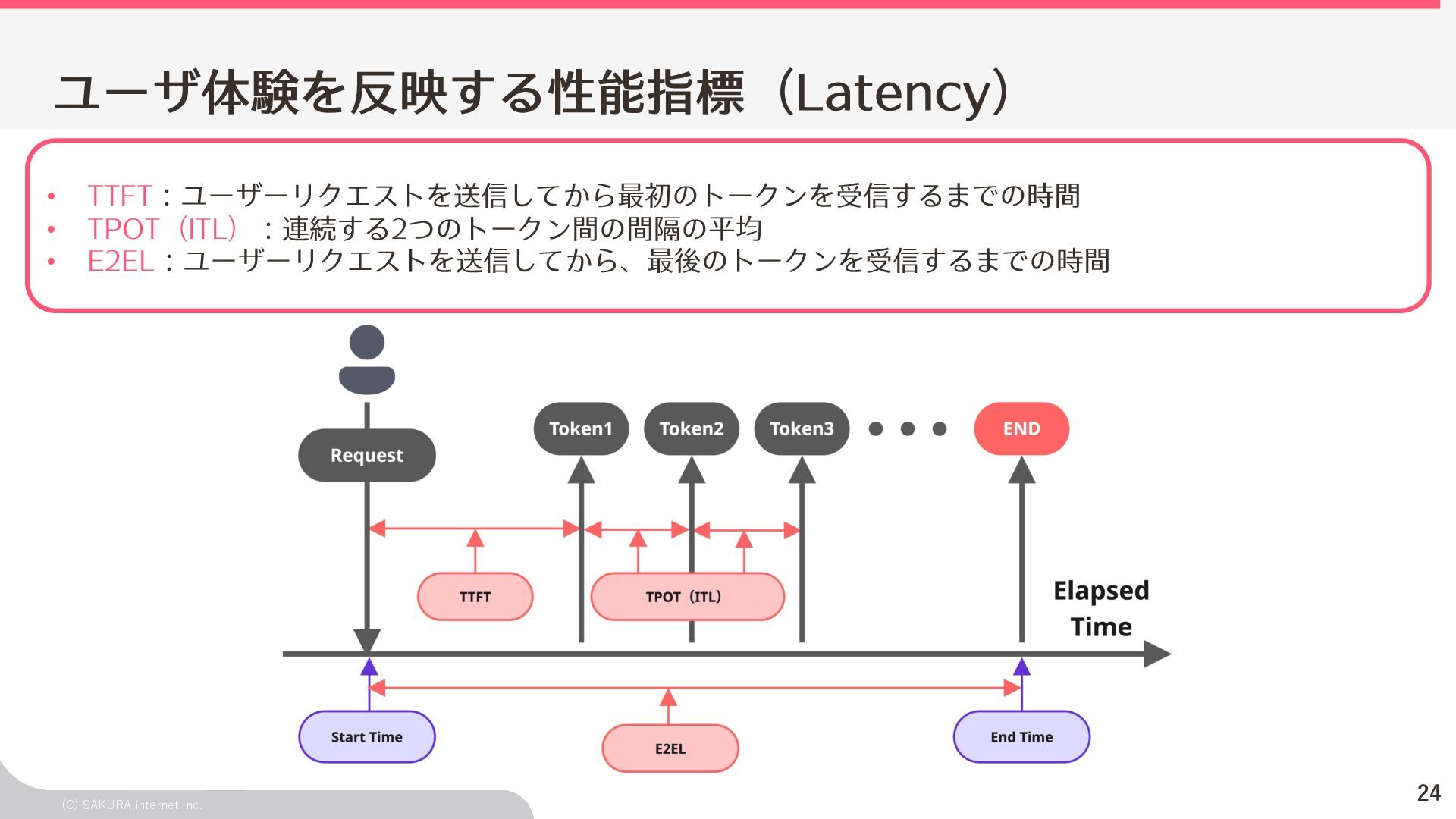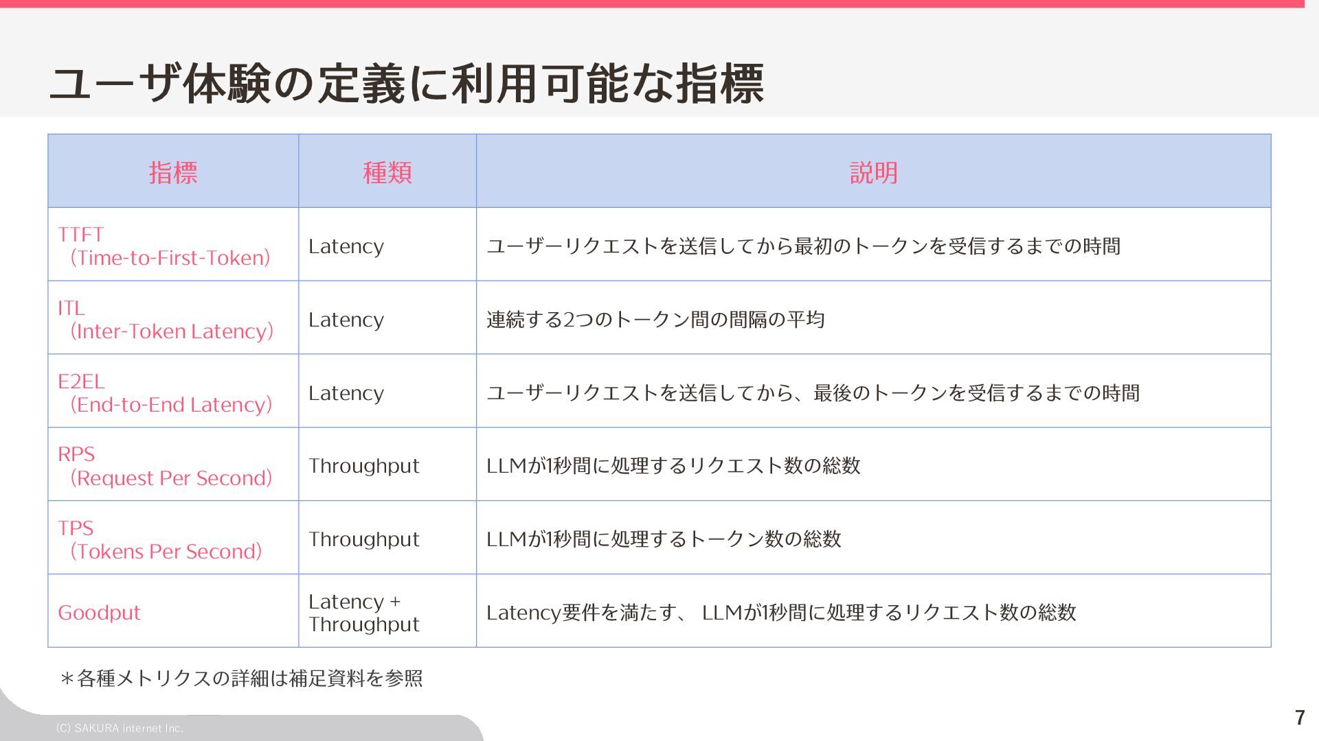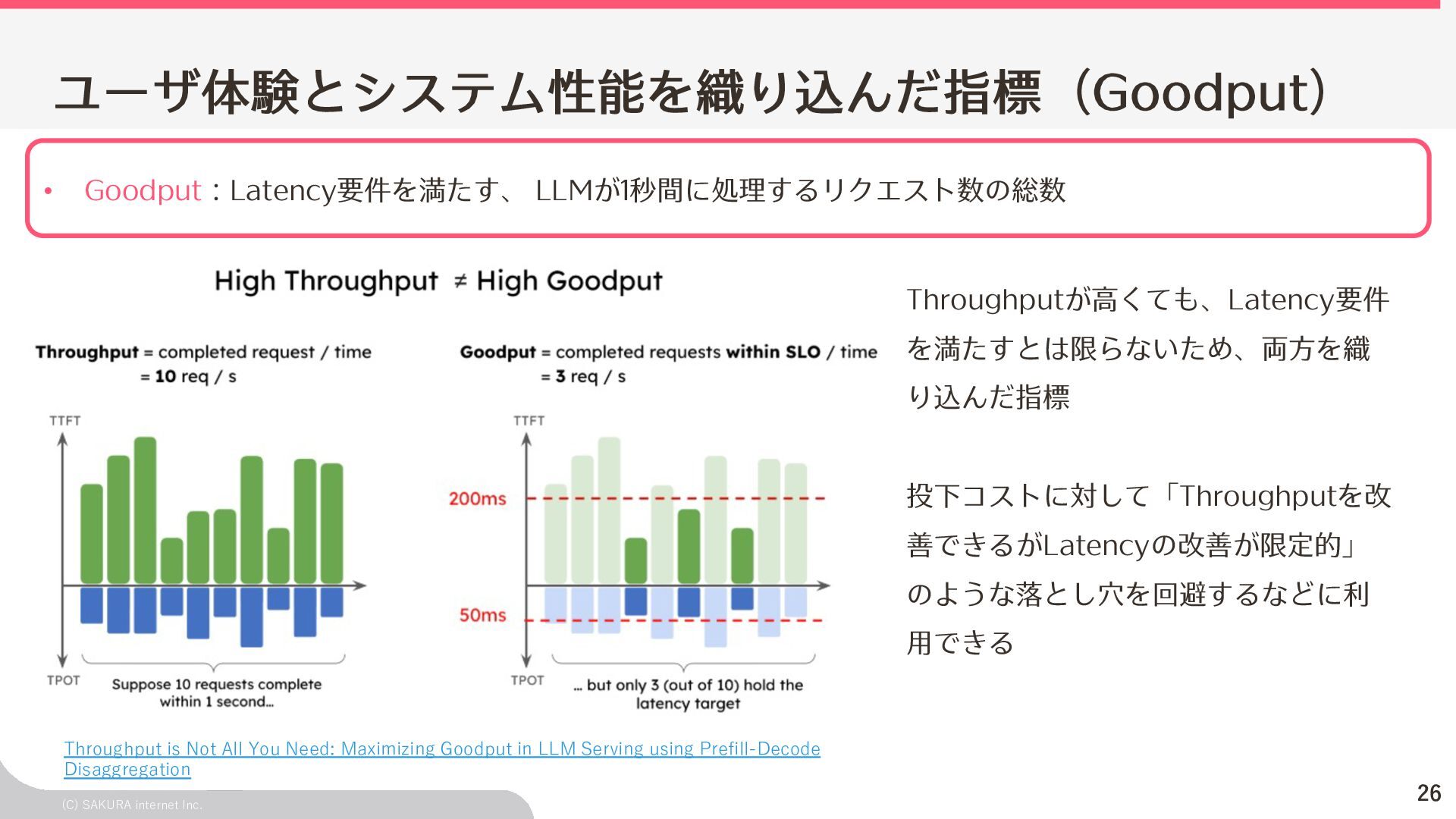 Goodput:Latency要件を満たす、 LLMが1秒間に処理するリクエスト数の総数 ユーザ体験とシステム性能を織り込んだ指標(Goodput) Throughputが⾼くても、Latency要件 を満たすとは限らないため、両⽅を織 り込んだ指標 投下コストに対して「Throughputを改 善できるがLatencyの改善が限定的」 のような落とし⽳を回避するなどに利 ⽤できる Throughput is Not All You Need: Maximizing Goodput in LLM Serving using Prefill-Decode Disaggregation