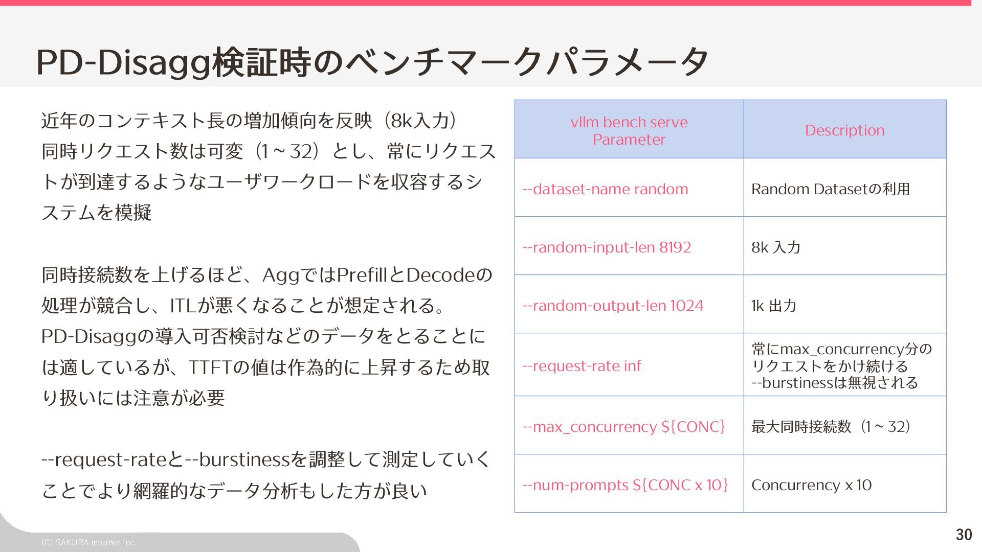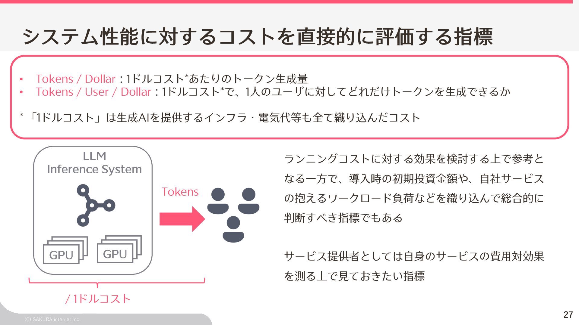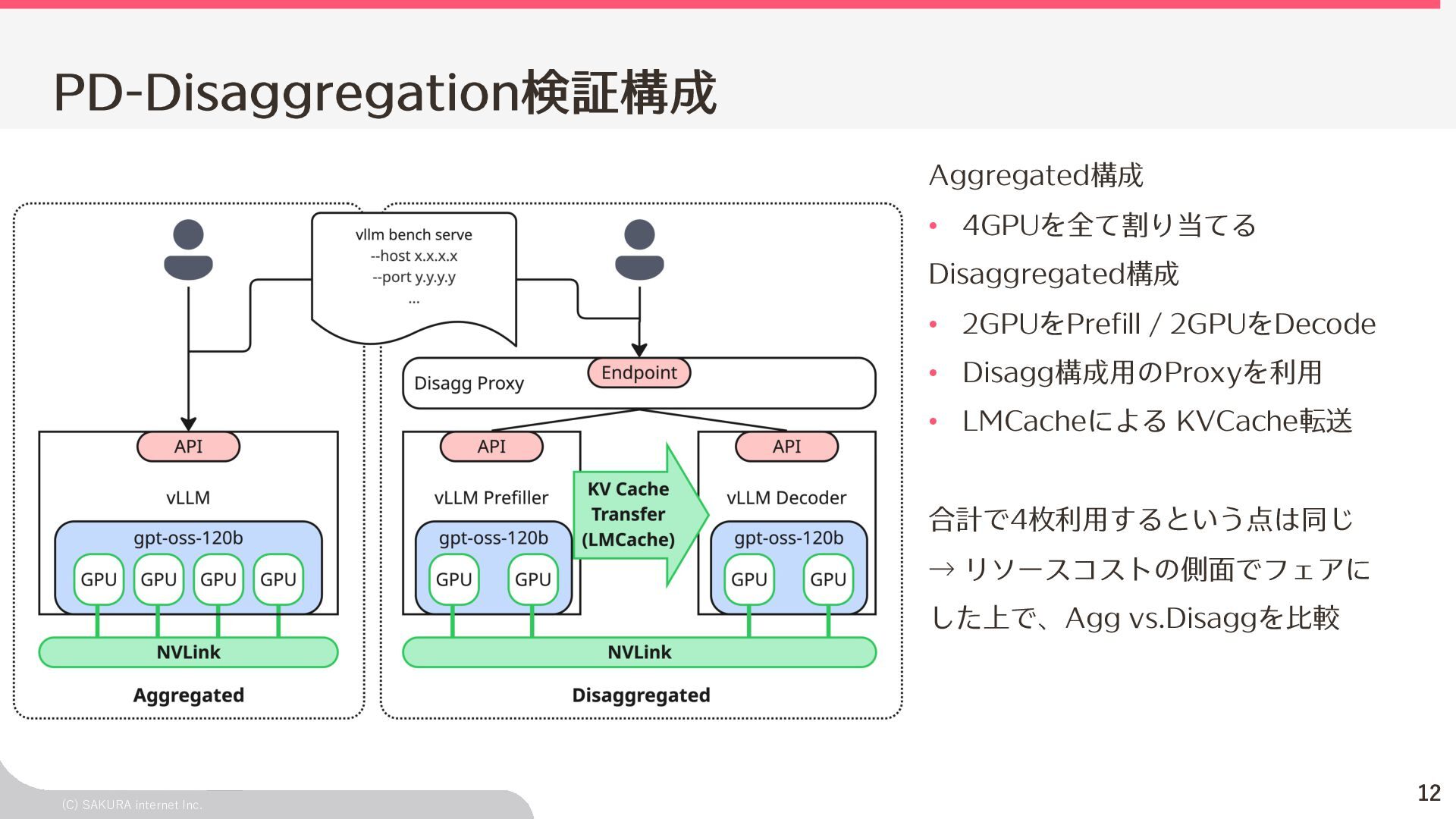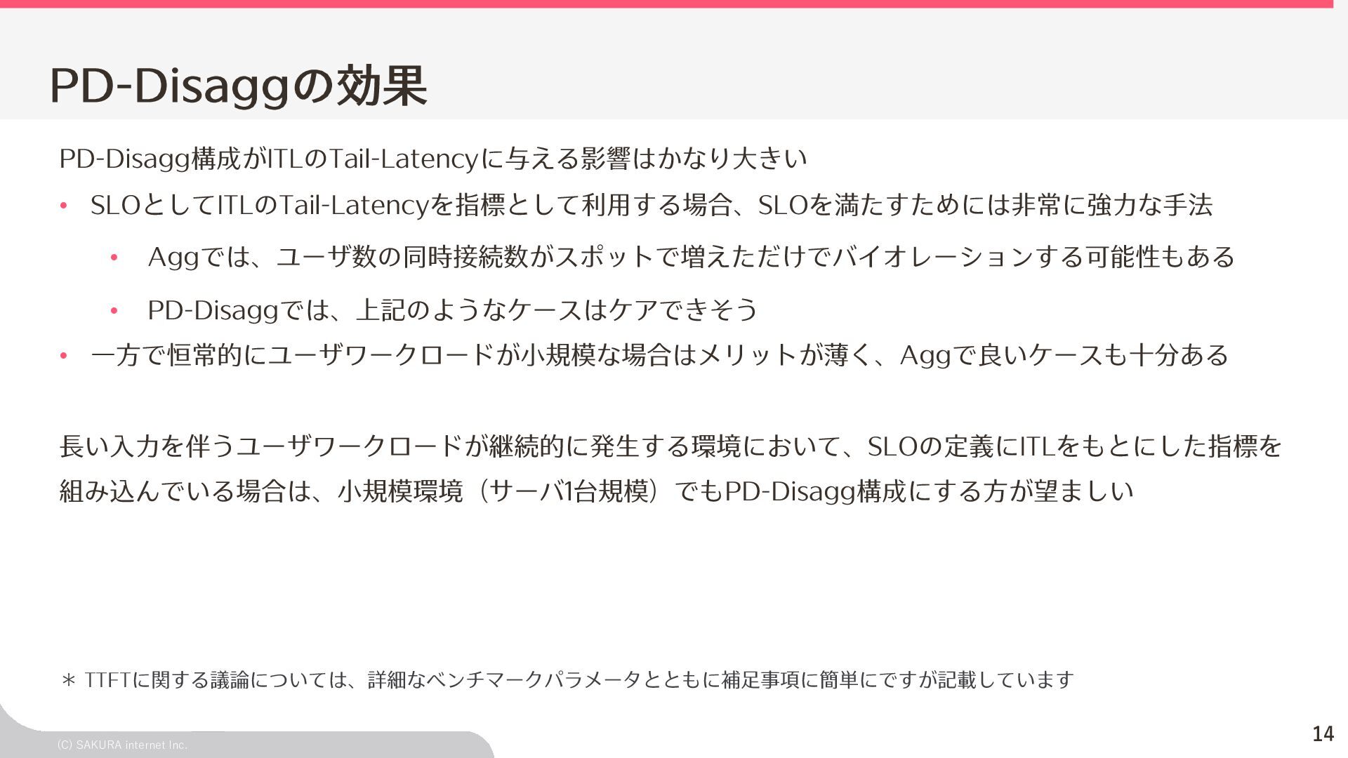 Goodput:Latency要件を満たす、 LLMが1秒間に処理するリクエスト数の総数 ユーザ体験とシステム性能を織り込んだ指標(Goodput) Throughputが⾼くても、Latency要件 を満たすとは限らないため、両⽅を織 り込んだ指標 投下コストに対して「Throughputを改 善できるがLatencyの改善が限定的」 のような落とし⽳を回避するなどに利 ⽤できる Throughput is Not All You Need: Maximizing Goodput in LLM Serving using Prefill-Decode Disaggregation