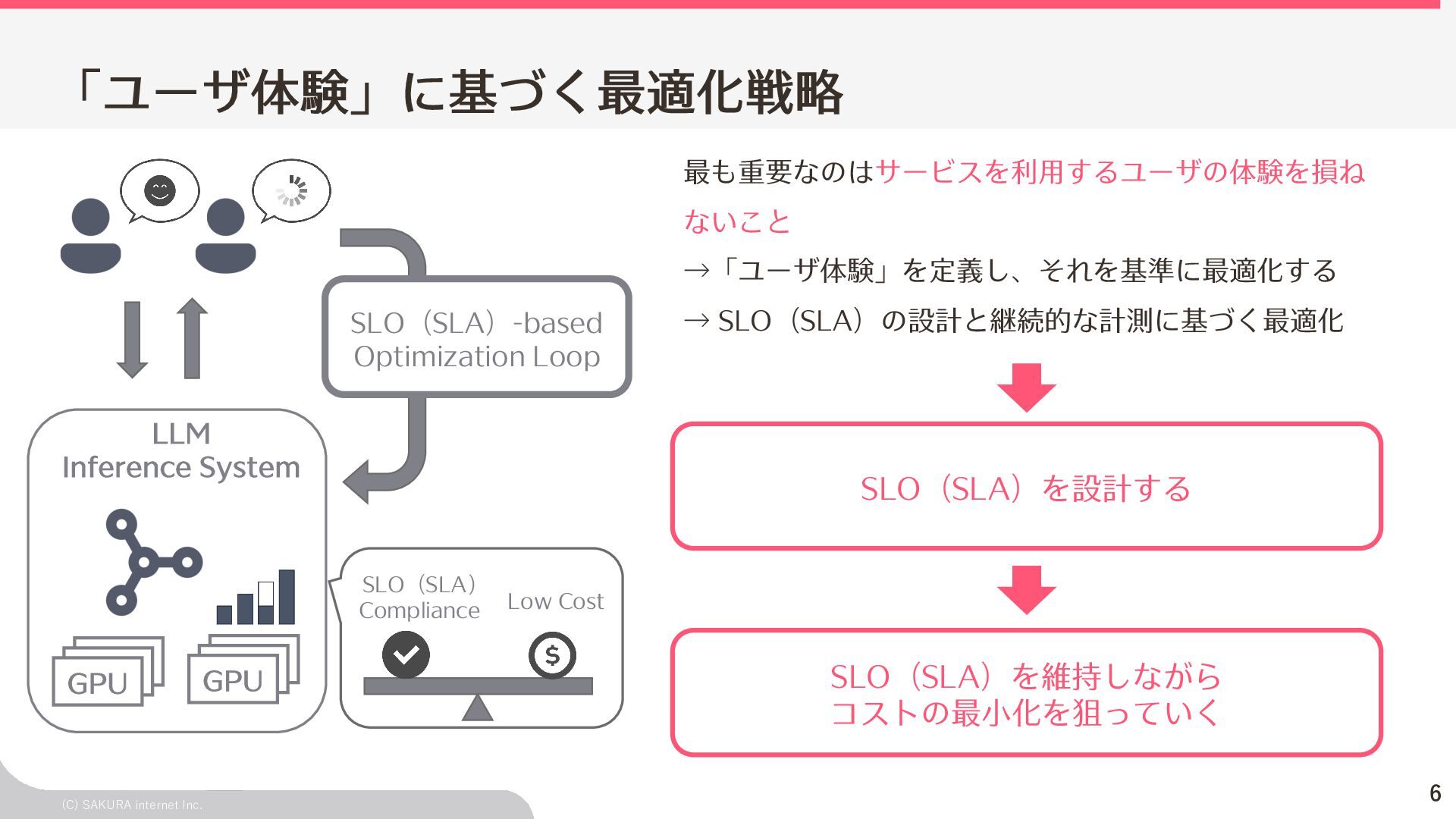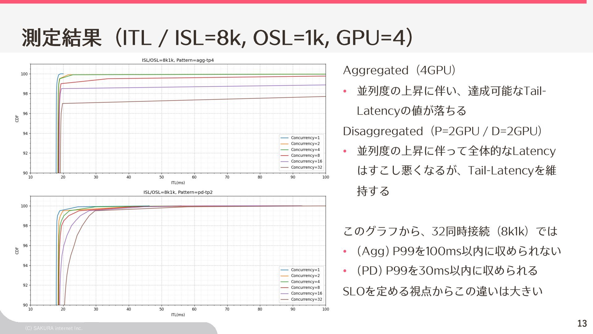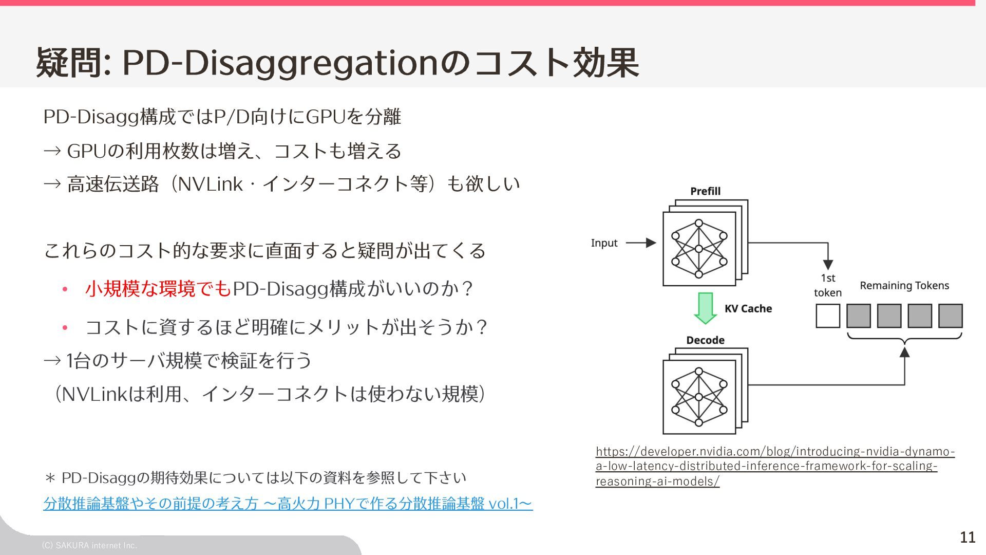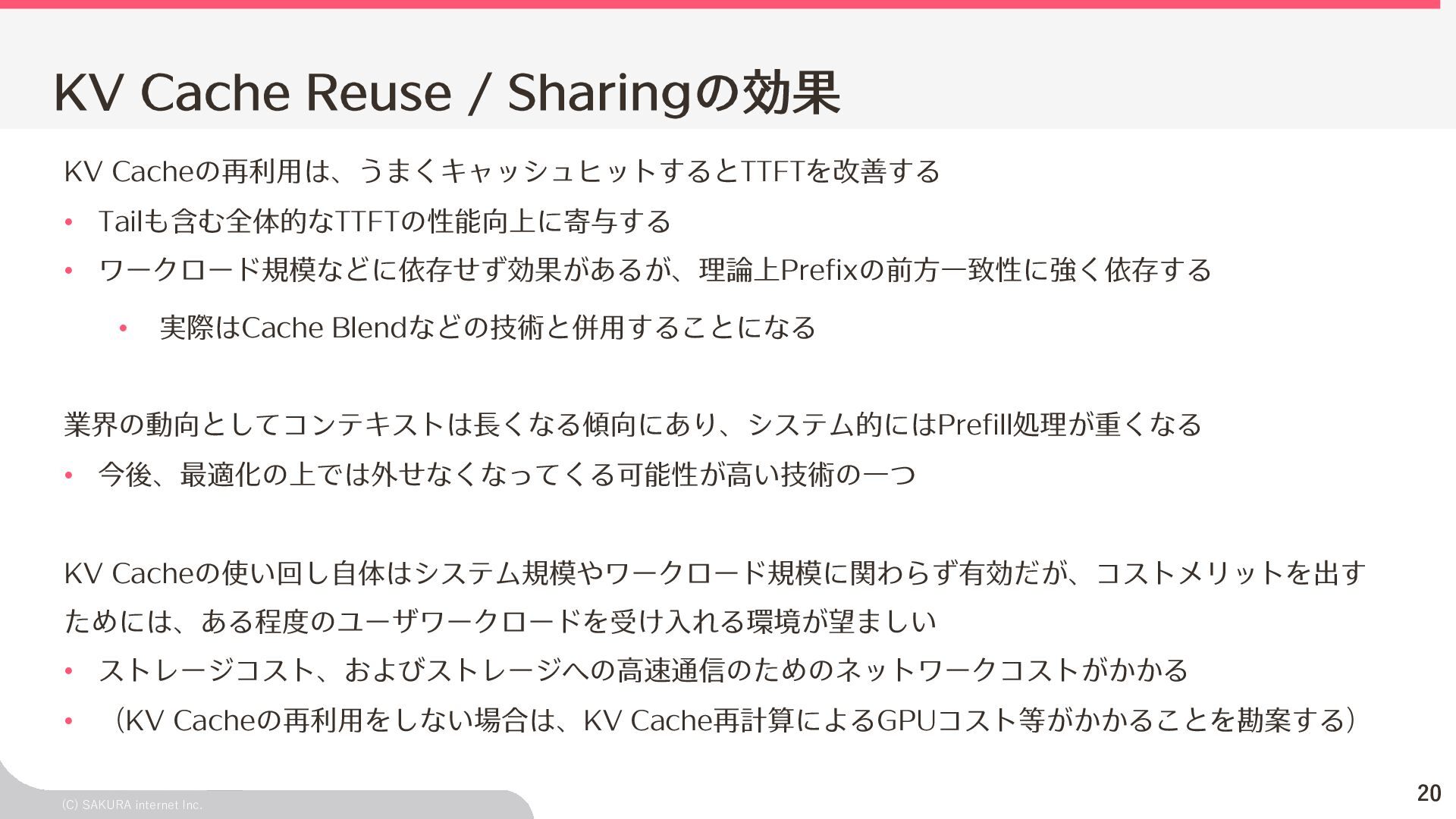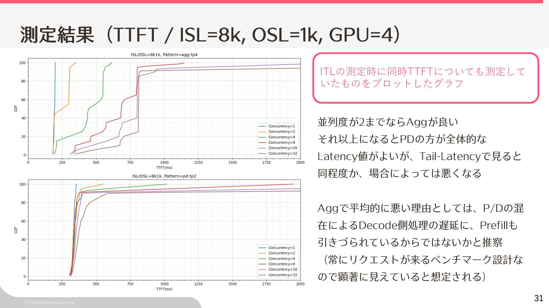Goodput:Latency要件を満たす、 LLMが1秒間に処理するリクエスト数の総数 ユーザ体験とシステム性能を織り込んだ指標(Goodput) Throughputが⾼くても、Latency要件 を満たすとは限らないため、両⽅を織 り込んだ指標 投下コストに対して「Throughputを改 善できるがLatencyの改善が限定的」 のような落とし⽳を回避するなどに利 ⽤できる Throughput is Not All You Need: Maximizing Goodput in LLM Serving using Prefill-Decode Disaggregation