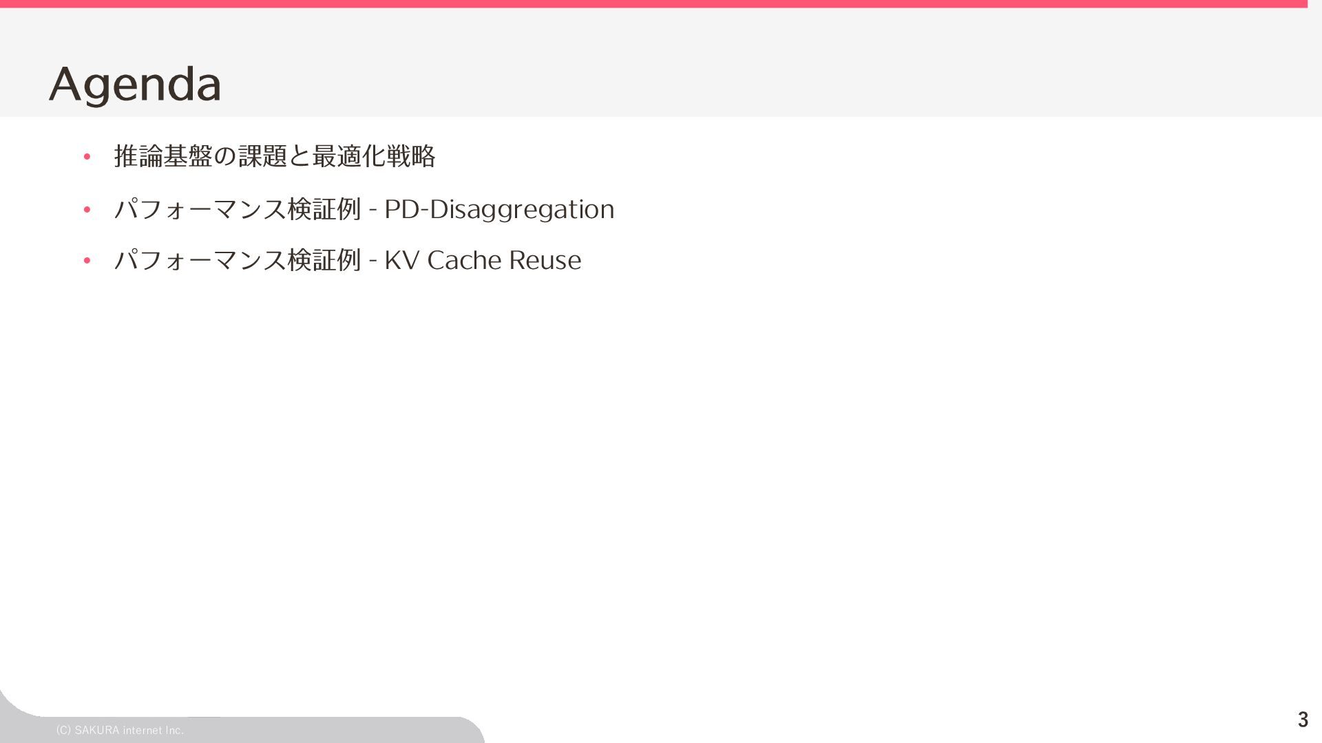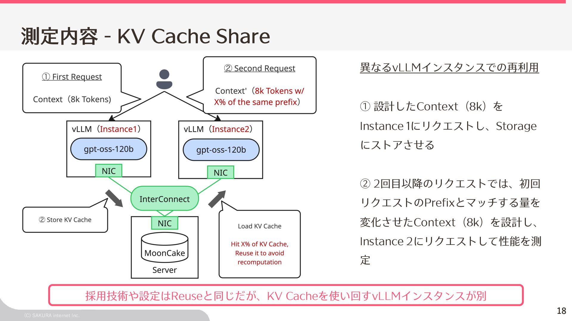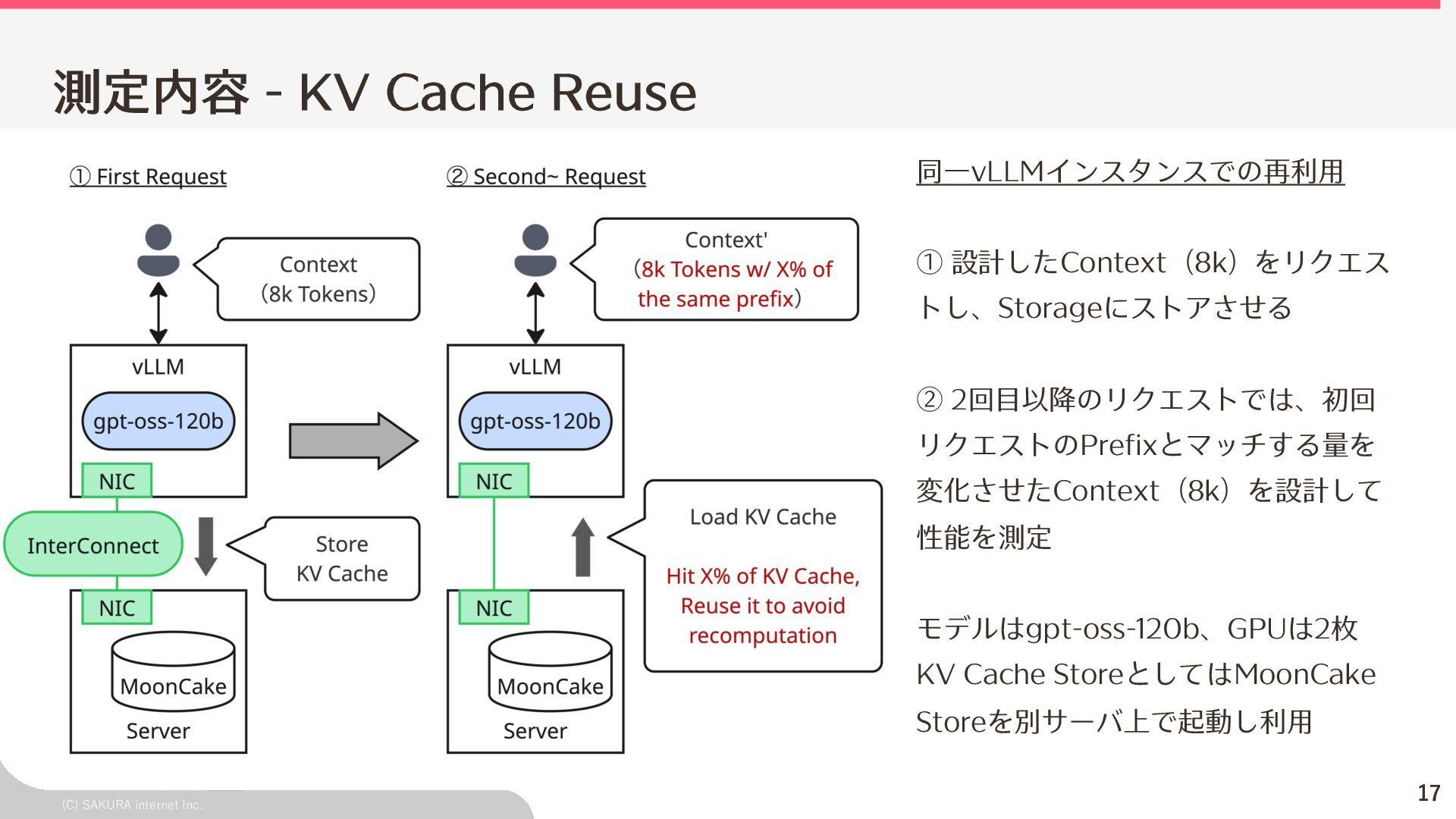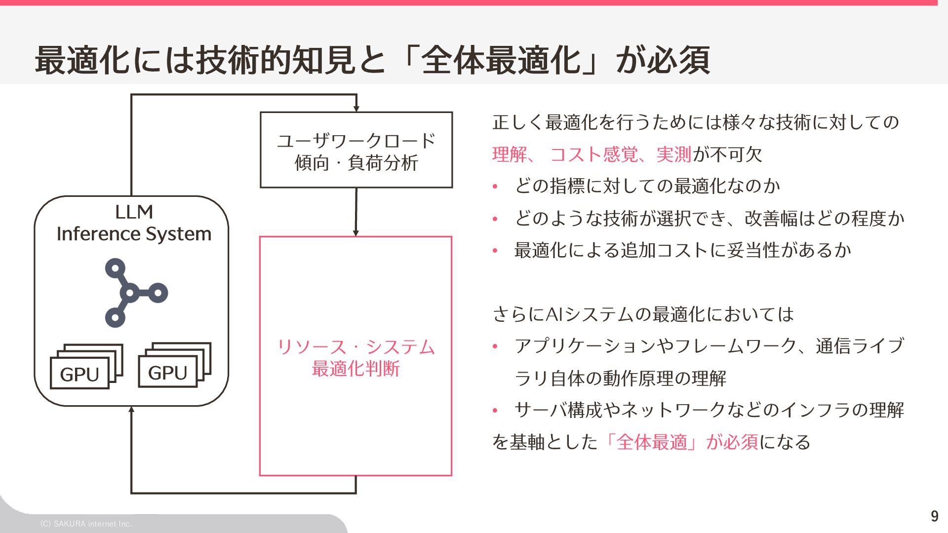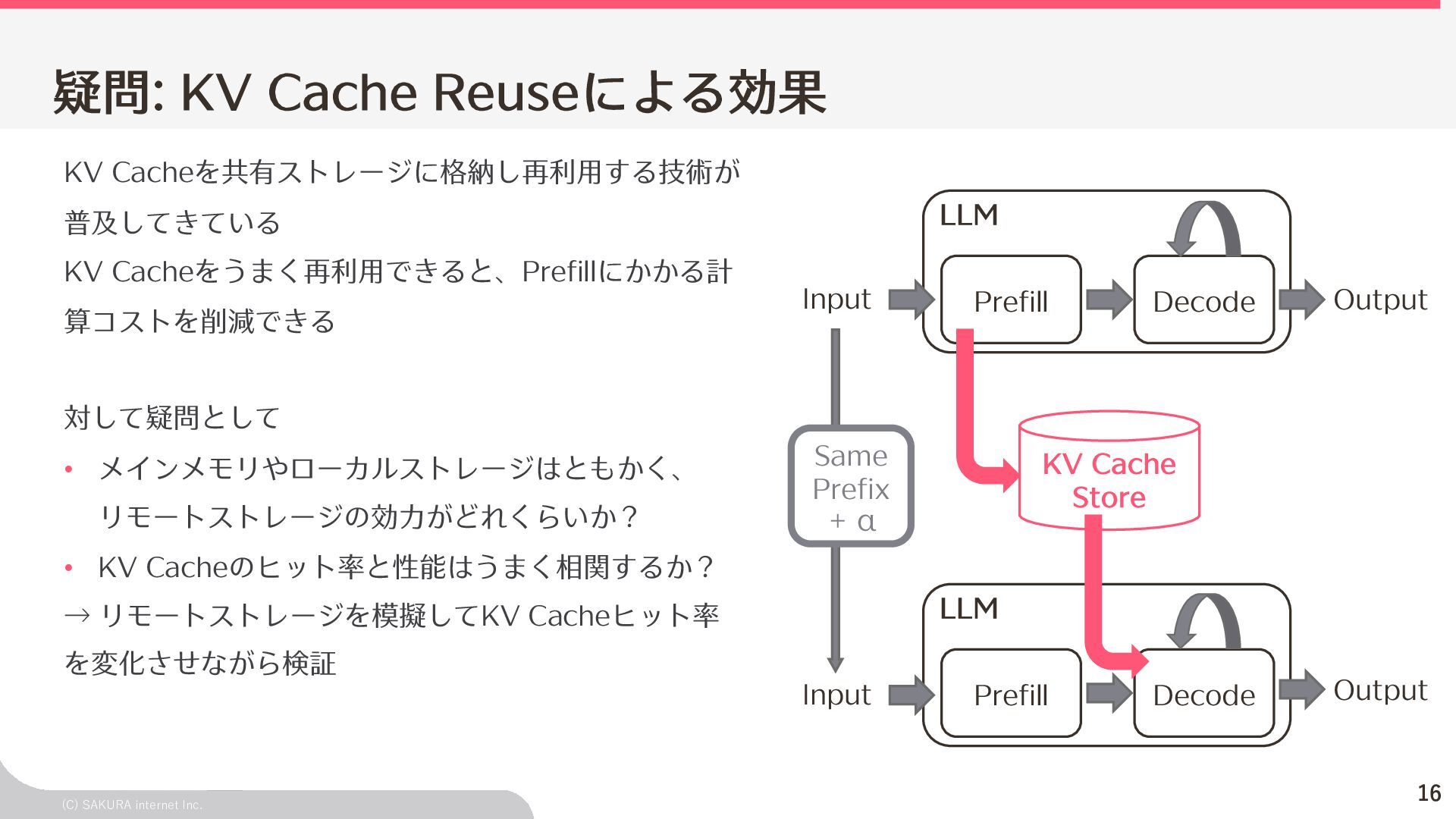 Goodput:Latency要件を満たす、 LLMが1秒間に処理するリクエスト数の総数 ユーザ体験とシステム性能を織り込んだ指標(Goodput) Throughputが⾼くても、Latency要件 を満たすとは限らないため、両⽅を織 り込んだ指標 投下コストに対して「Throughputを改 善できるがLatencyの改善が限定的」 のような落とし⽳を回避するなどに利 ⽤できる Throughput is Not All You Need: Maximizing Goodput in LLM Serving using Prefill-Decode Disaggregation