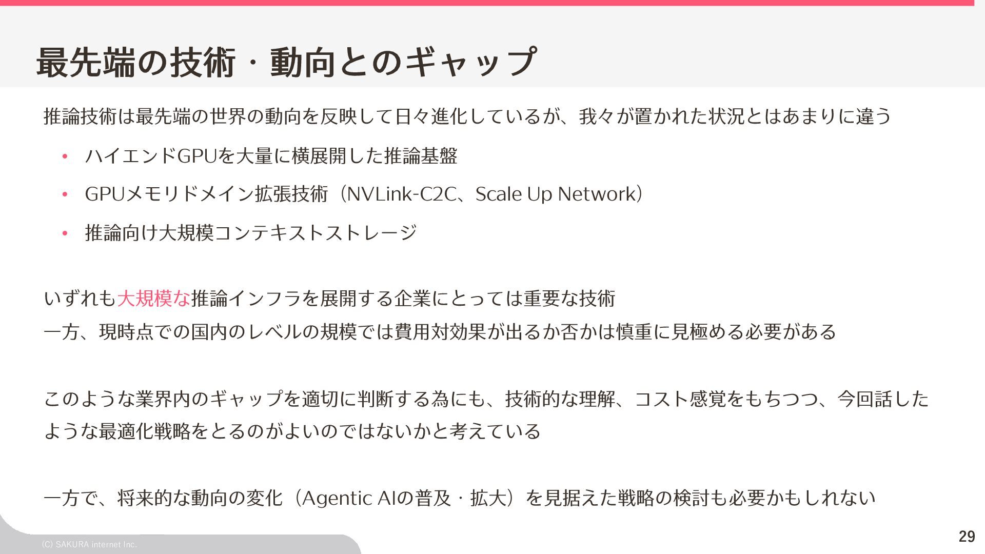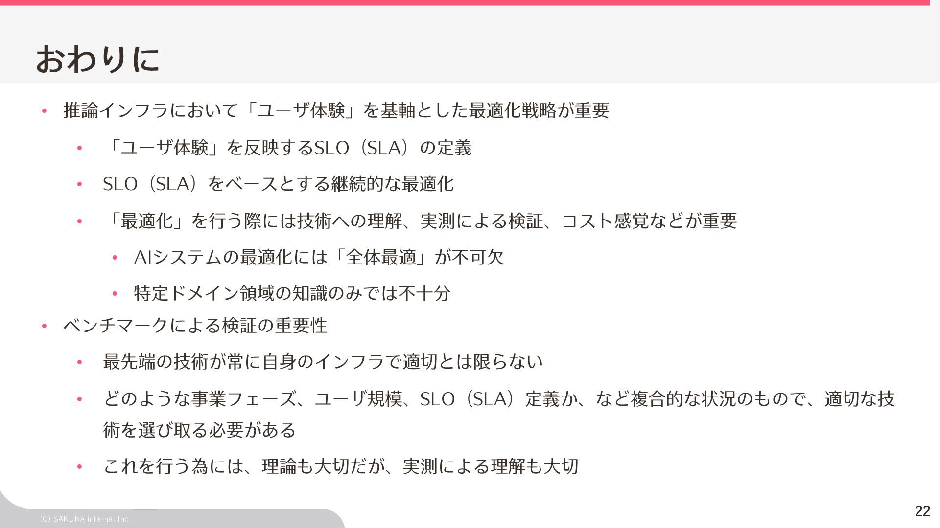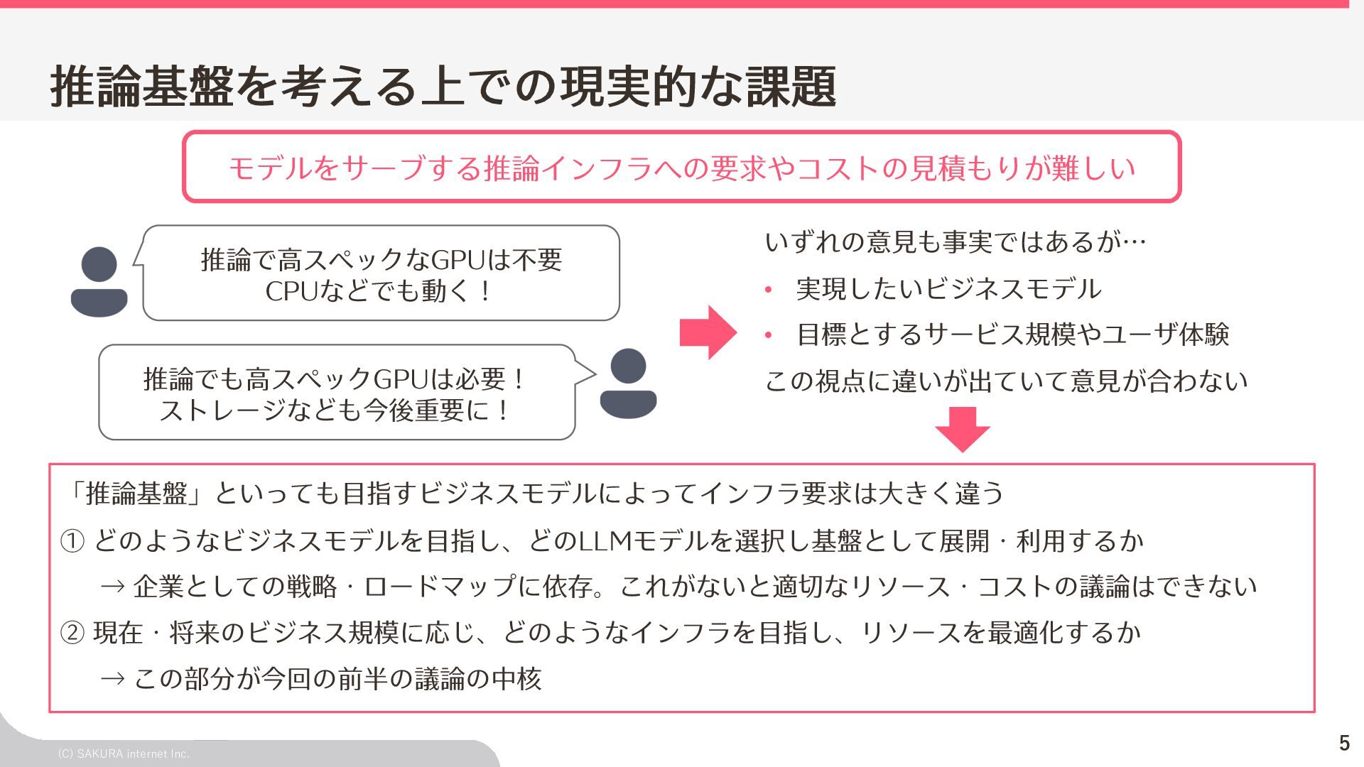 - モデルの精度 今回の話は「システムの性能がユーザ体験を損ねない程 度に⼗分か?」という指標 ⼀⽅でユーザはこれ以外にも「欲しい結果を返してくれ る」などの「精度」のような評価軸も存在する ビジネス戦略・ロードマップの策定などにおいては、こ の変量も織り交ぜた判断が求められる Model A GPU GPU GPU Model B 取り扱うモデルによって 推論基盤への要求も「⼤きく」変わる モデルの違いによって精度も⼤きく変わる ◎ ×