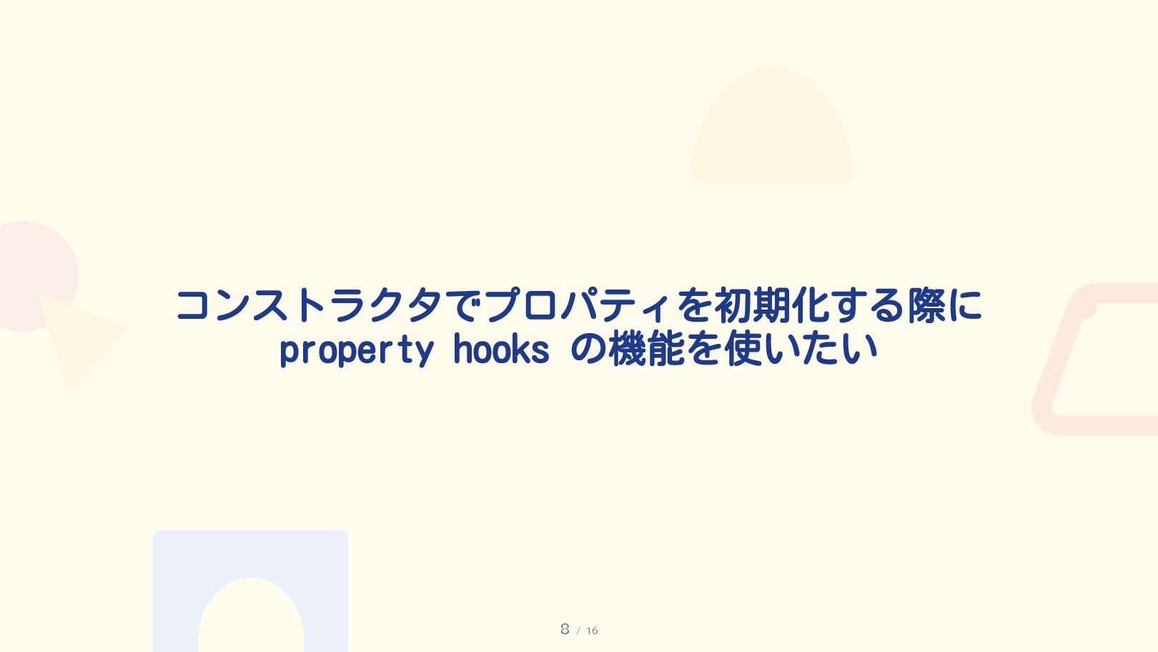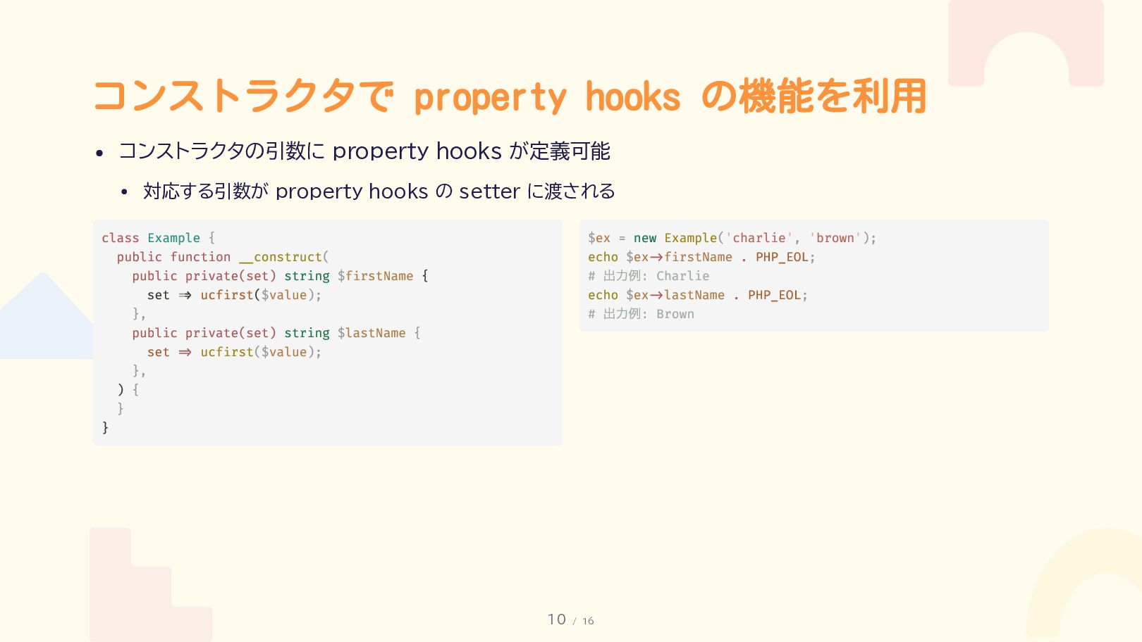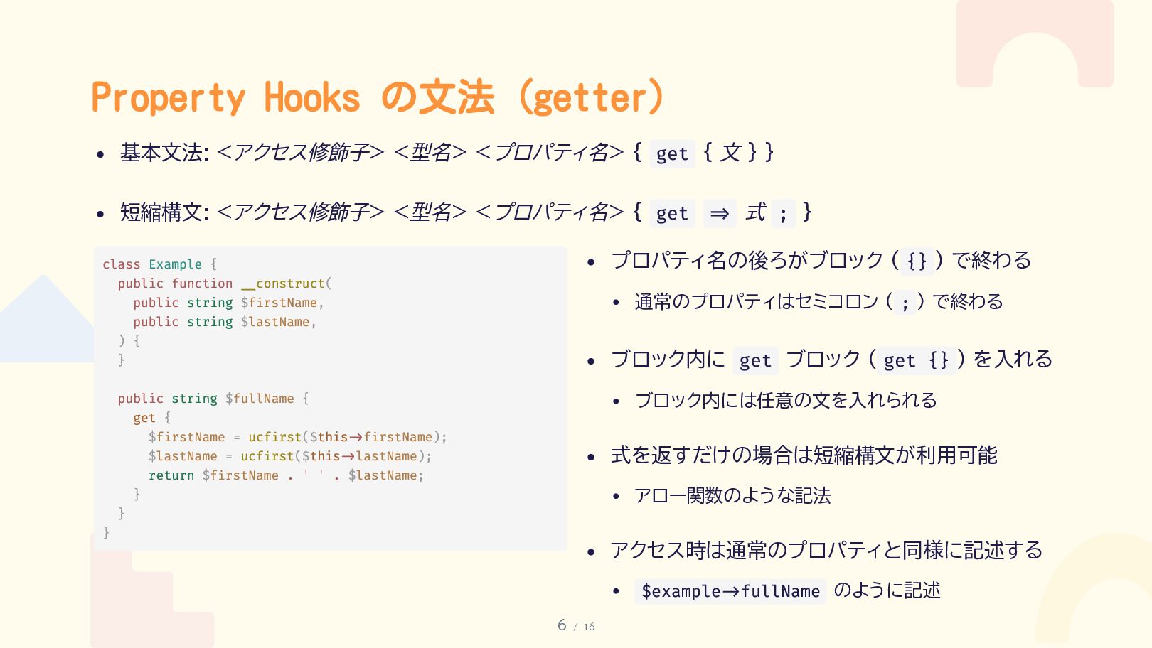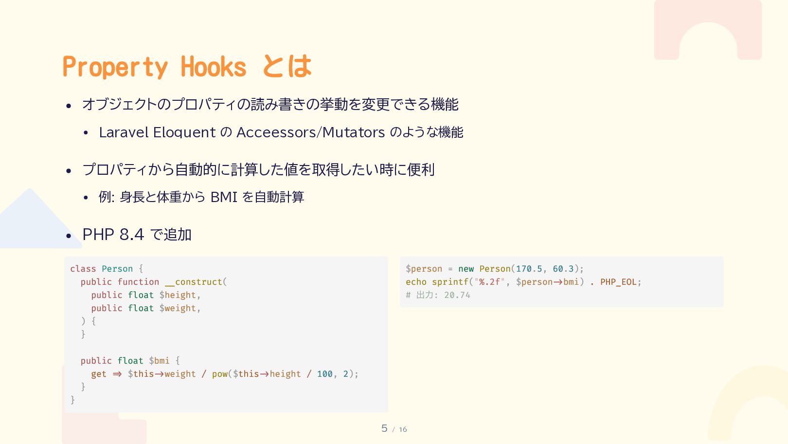 例: 身長と体重から BMI を自動計算 PHP 8.4 で追加 class Person { public function __construct( public float $height, public float $weight, ) { } public float $bmi { get => $this->weight / pow($this->height / 100, 2); } } $person = new Person(170.5, 60.3); echo sprintf("%.2f", $person->bmi) . PHP_EOL; # 出力: 20.74 5 / 16