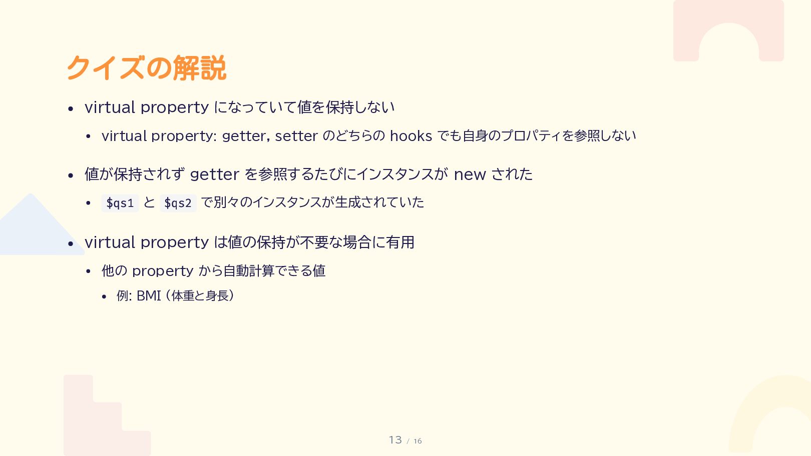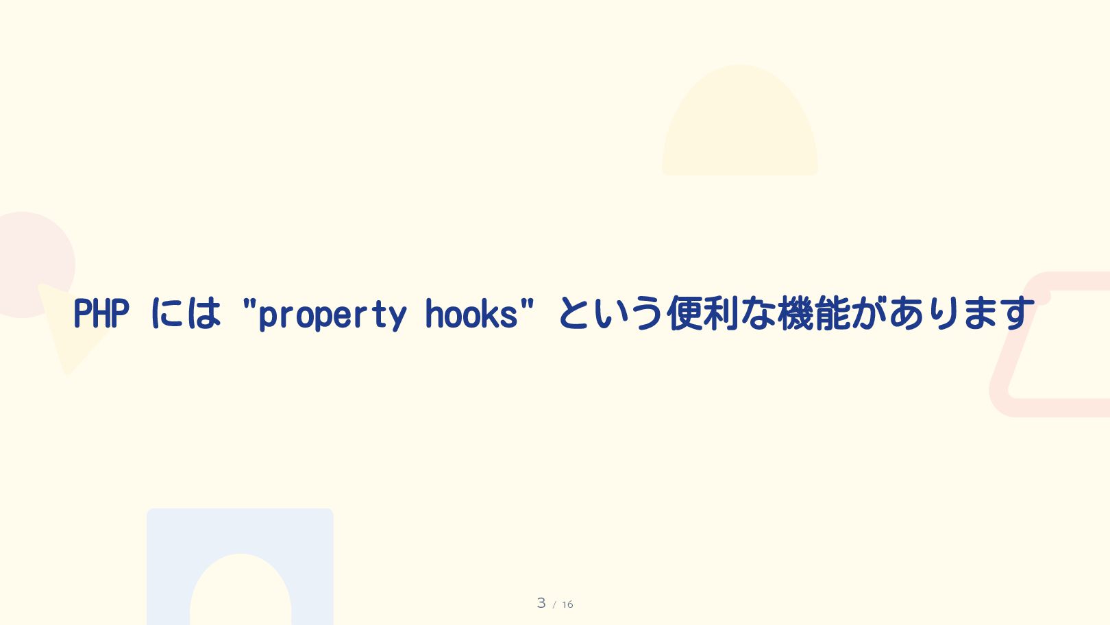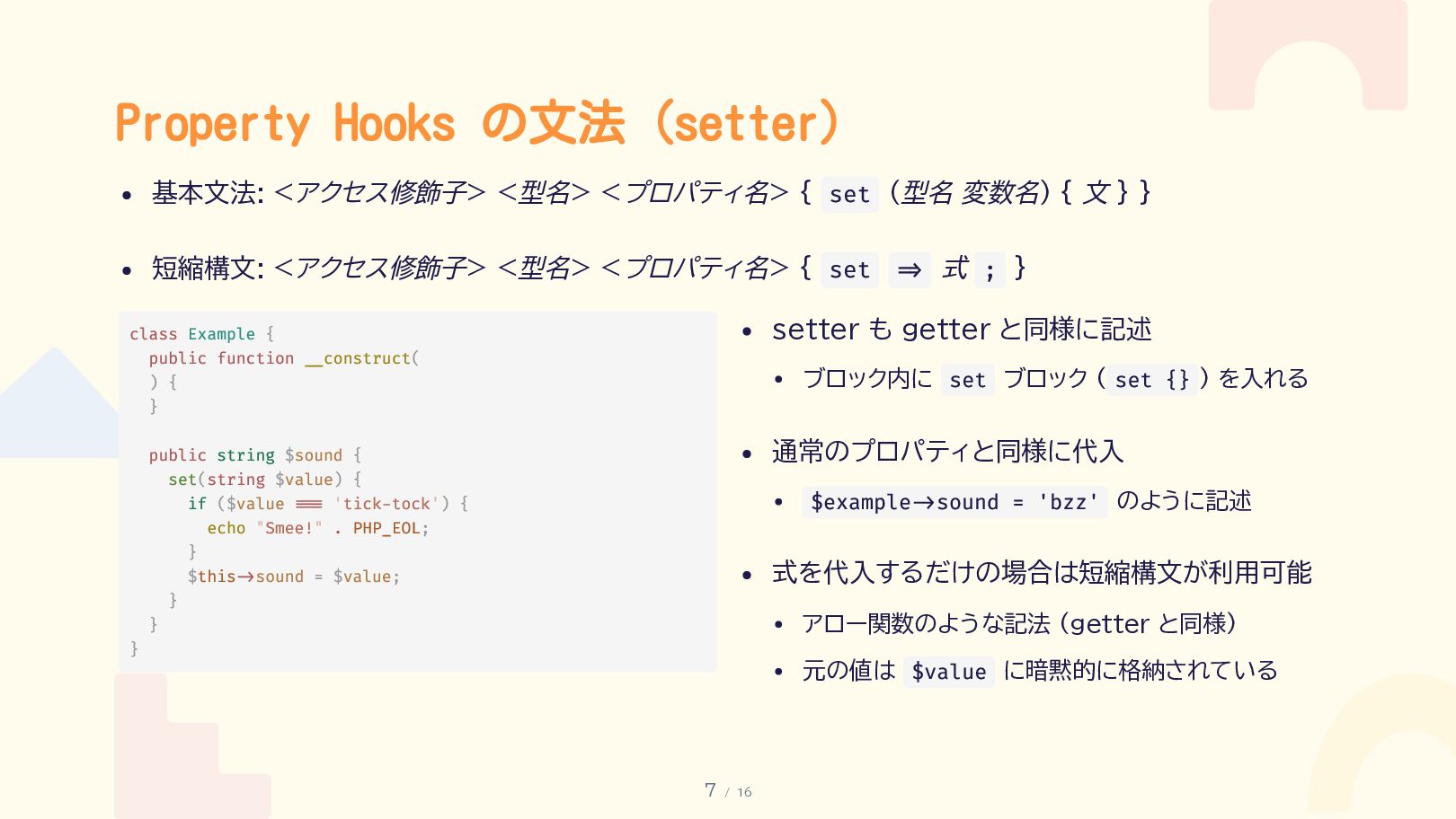 例: 身長と体重から BMI を自動計算 PHP 8.4 で追加 class Person { public function __construct( public float $height, public float $weight, ) { } public float $bmi { get => $this->weight / pow($this->height / 100, 2); } } $person = new Person(170.5, 60.3); echo sprintf("%.2f", $person->bmi) . PHP_EOL; # 出力: 20.74 5 / 16