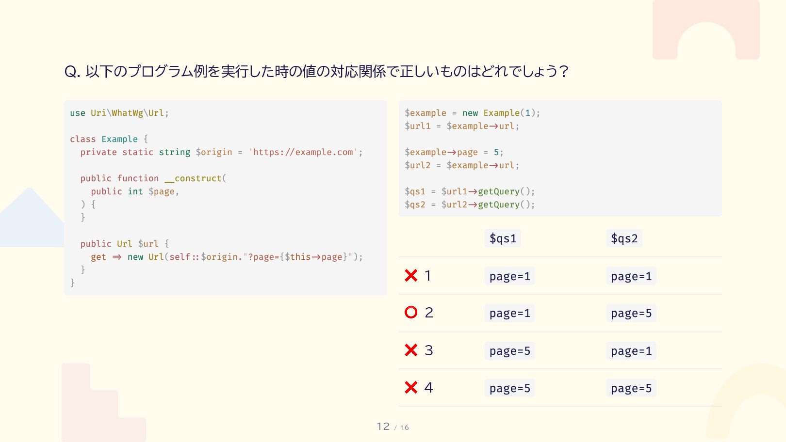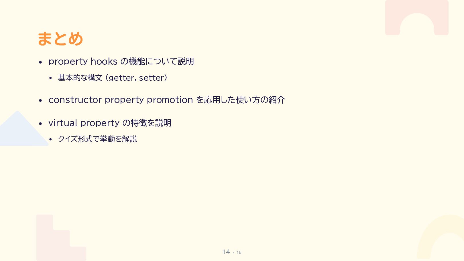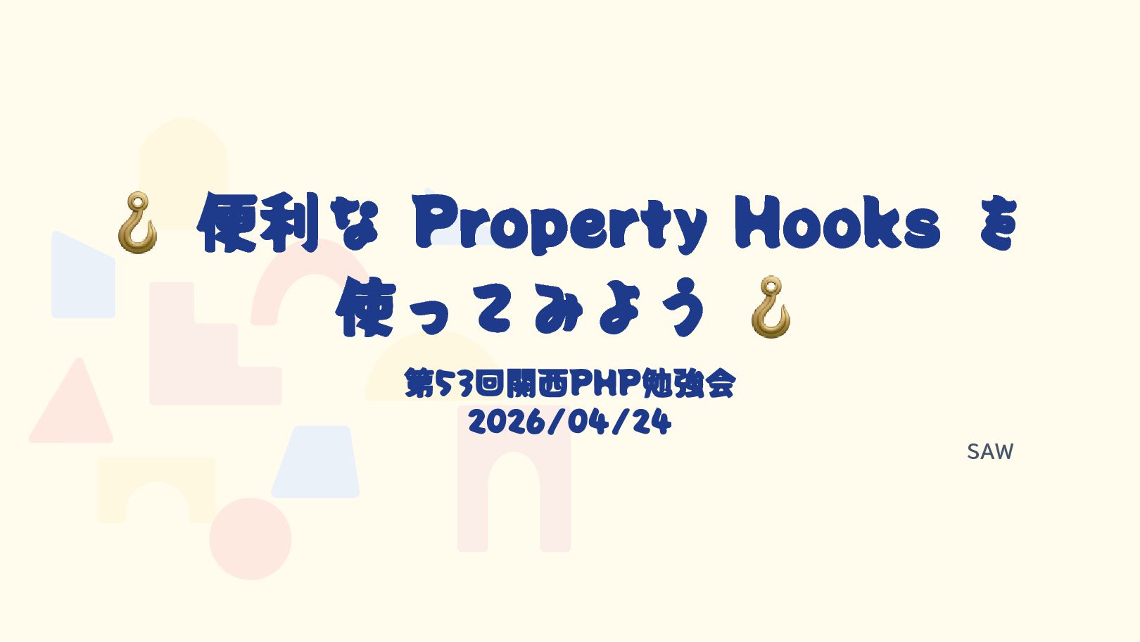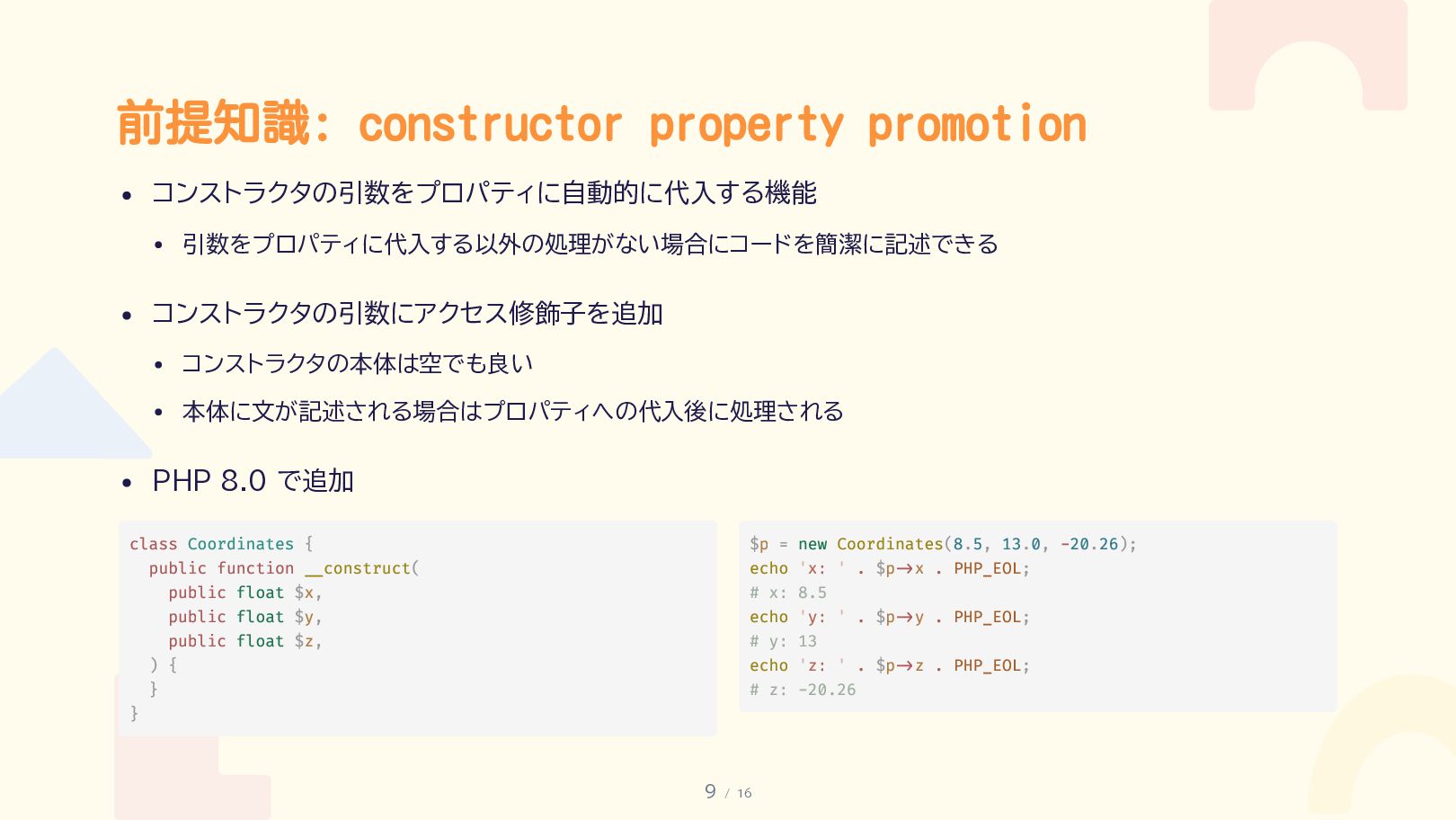 例: 身長と体重から BMI を自動計算 PHP 8.4 で追加 class Person { public function __construct( public float $height, public float $weight, ) { } public float $bmi { get => $this->weight / pow($this->height / 100, 2); } } $person = new Person(170.5, 60.3); echo sprintf("%.2f", $person->bmi) . PHP_EOL; # 出力: 20.74 5 / 16