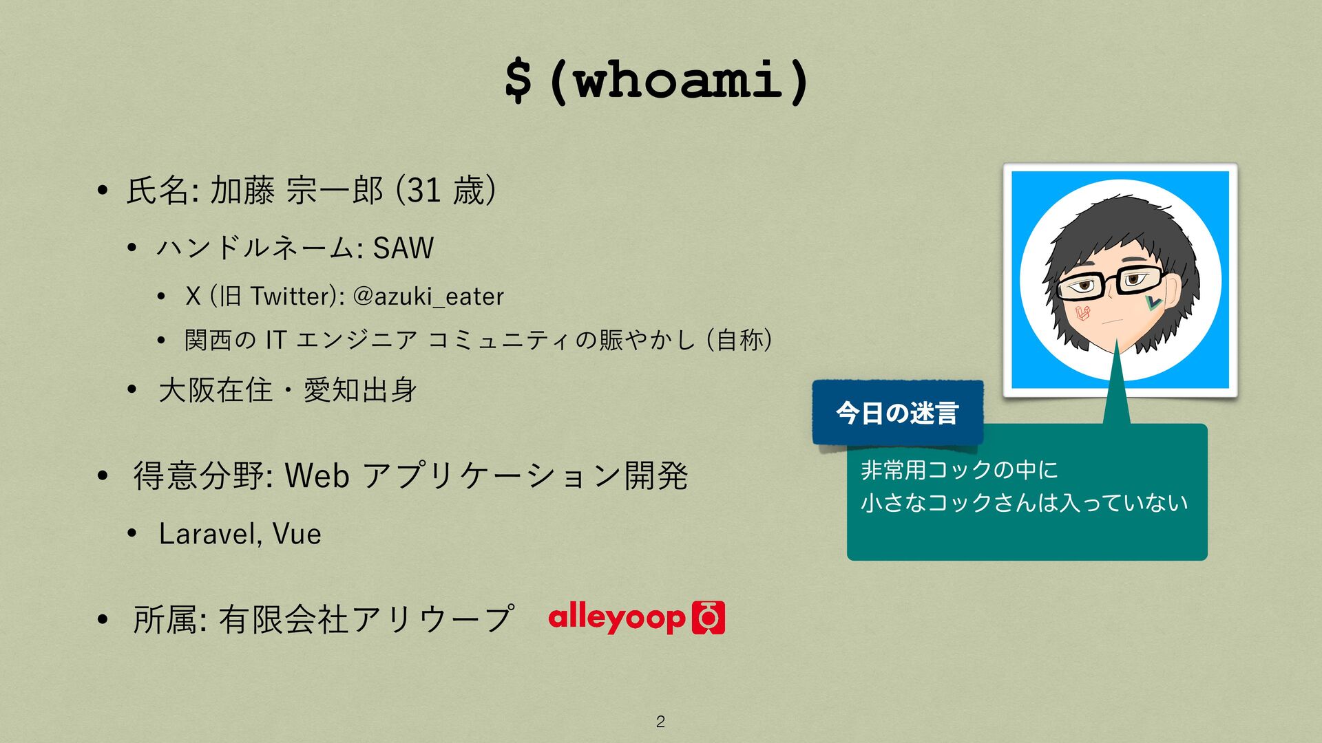 $(whoami) w ࢯ໊Ճ౻फҰ ࡀ w ϋϯυϧωʔϜ4"8 w 9 چ5XJUUFS