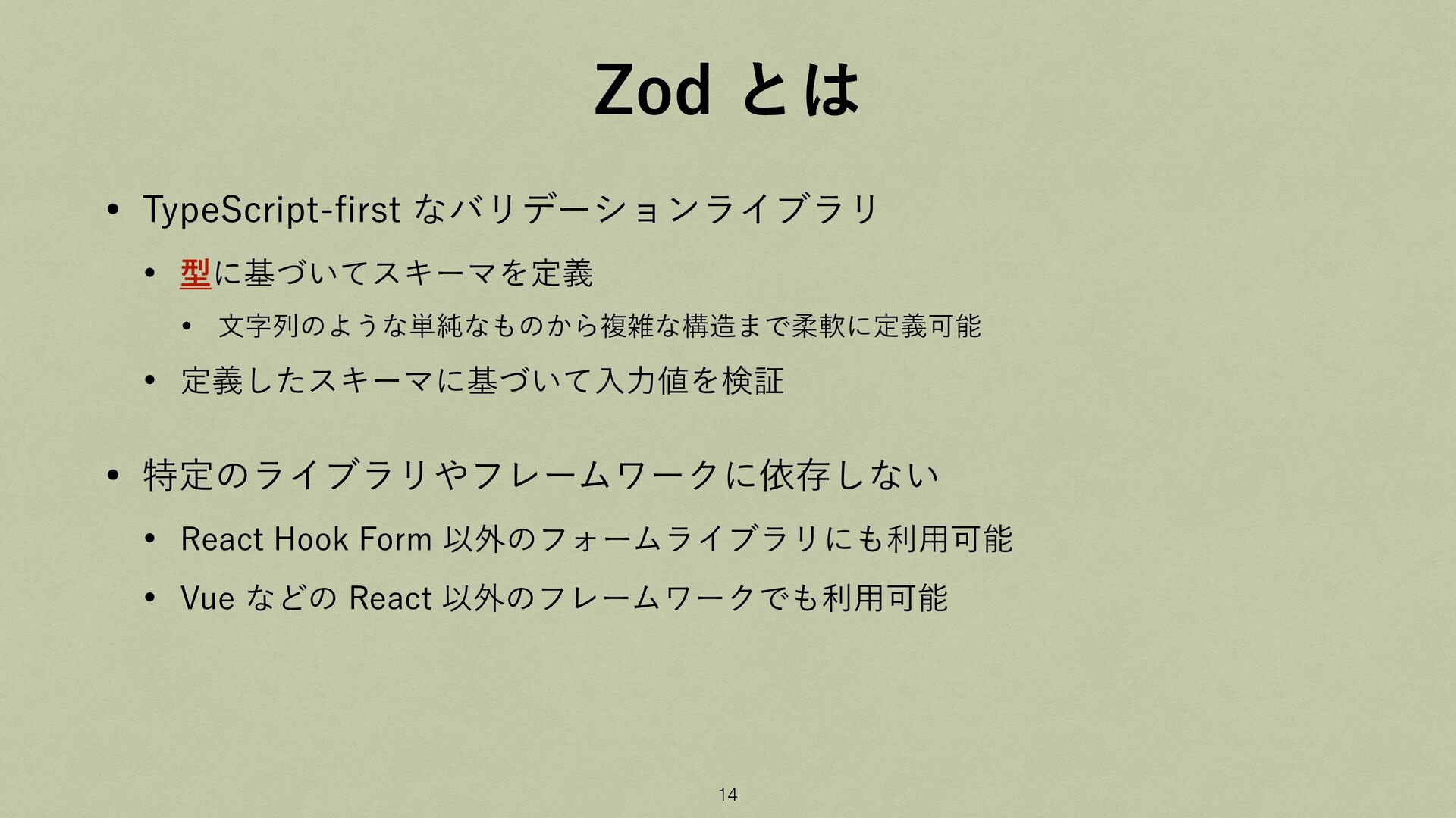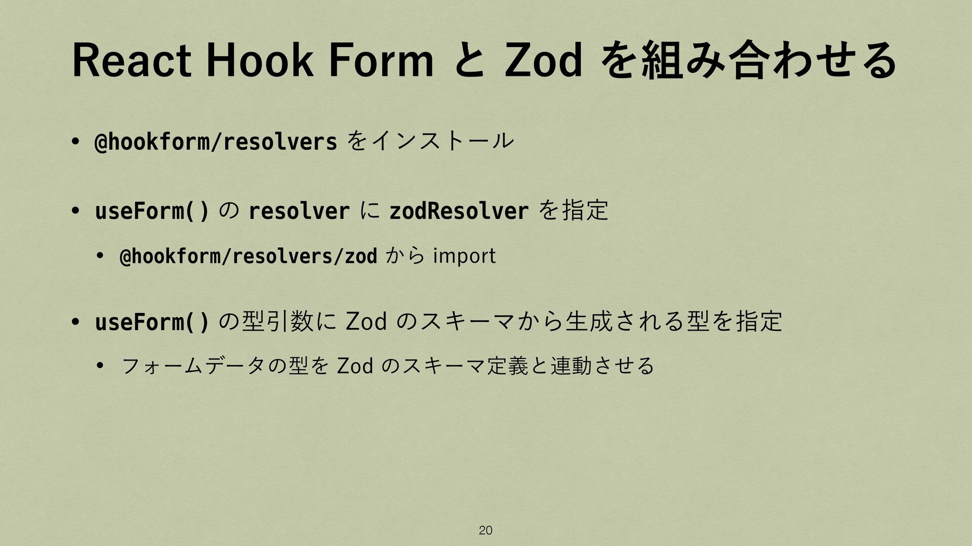 3FBDU)PPL'PSNͱ;PEΛΈ߹ΘͤΔ w @hookform/resolversΛΠϯετʔϧ w useForm()ͷresolverʹzodResolverΛࢦఆ w @hookform/resolvers/zod͔ΒJNQPSU w useForm()ͷܕҾʹ;PEͷεΩʔϚ͔Βੜ͞ΕΔܕΛࢦఆ w