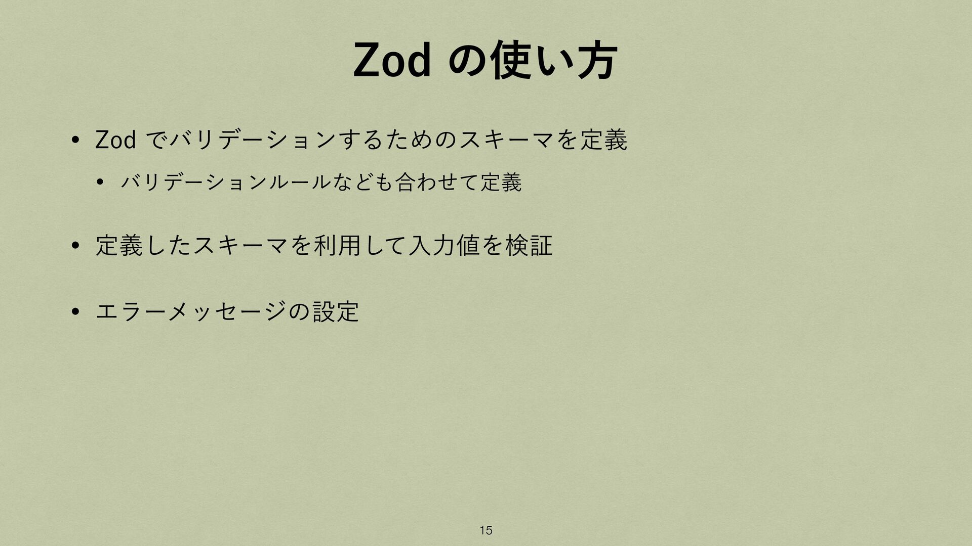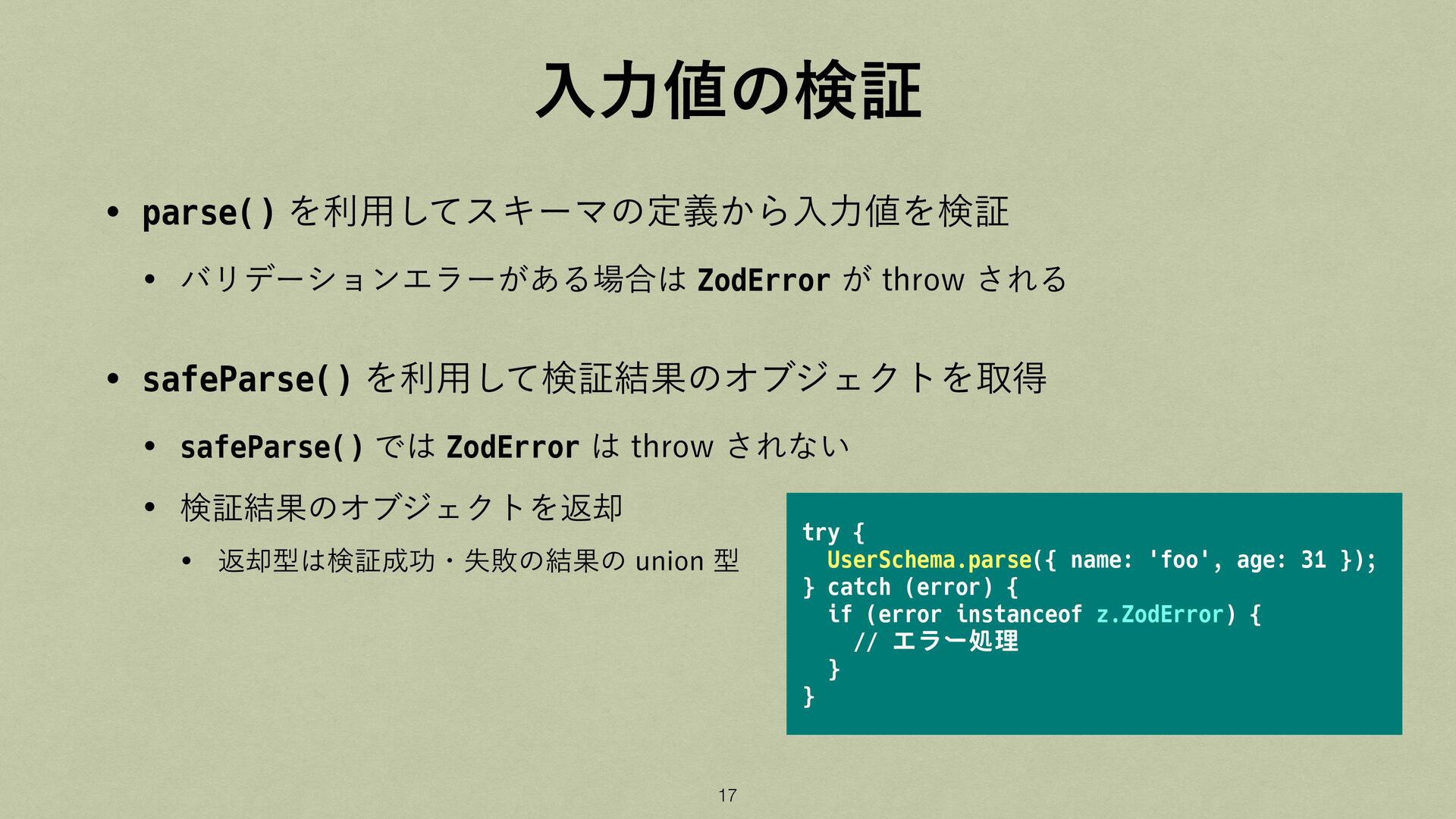 ೖྗͷݕূ w parse()Λར༻ͯ͠εΩʔϚͷఆ͔ٛΒೖྗΛݕূ w όϦσʔγϣϯΤϥʔ͕͋Δ߹ZodError͕UISPX͞ΕΔ w safeParse()Λར༻ͯ͠ݕূ݁ՌͷΦϒδΣΫτΛऔಘ w safeParse()ͰZodErrorUISPX͞Εͳ͍ w