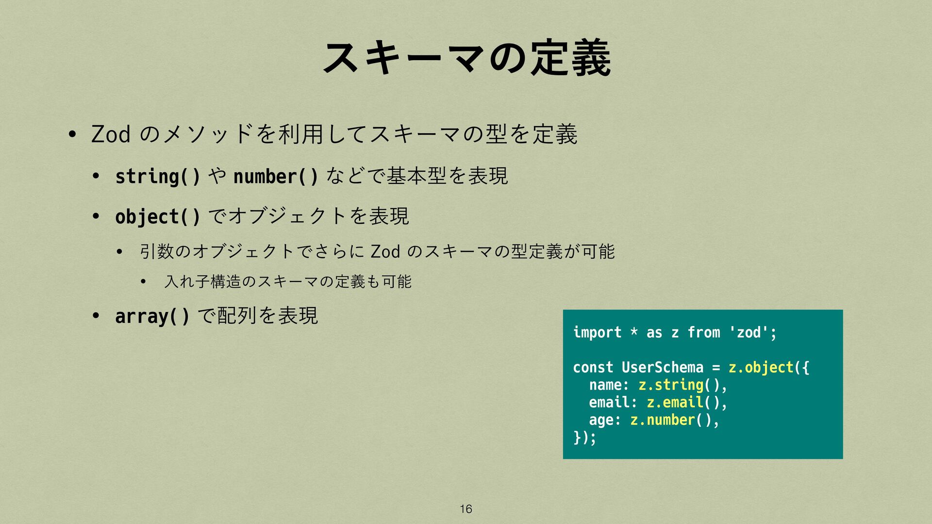 ೖΕࢠߏͷεΩʔϚͷఆٛՄೳ w array()ͰྻΛදݱ 16 import * as z from 'zod'; const UserSchema = z.object({ name: z.string(), email: z.email(), age: z.number(), });