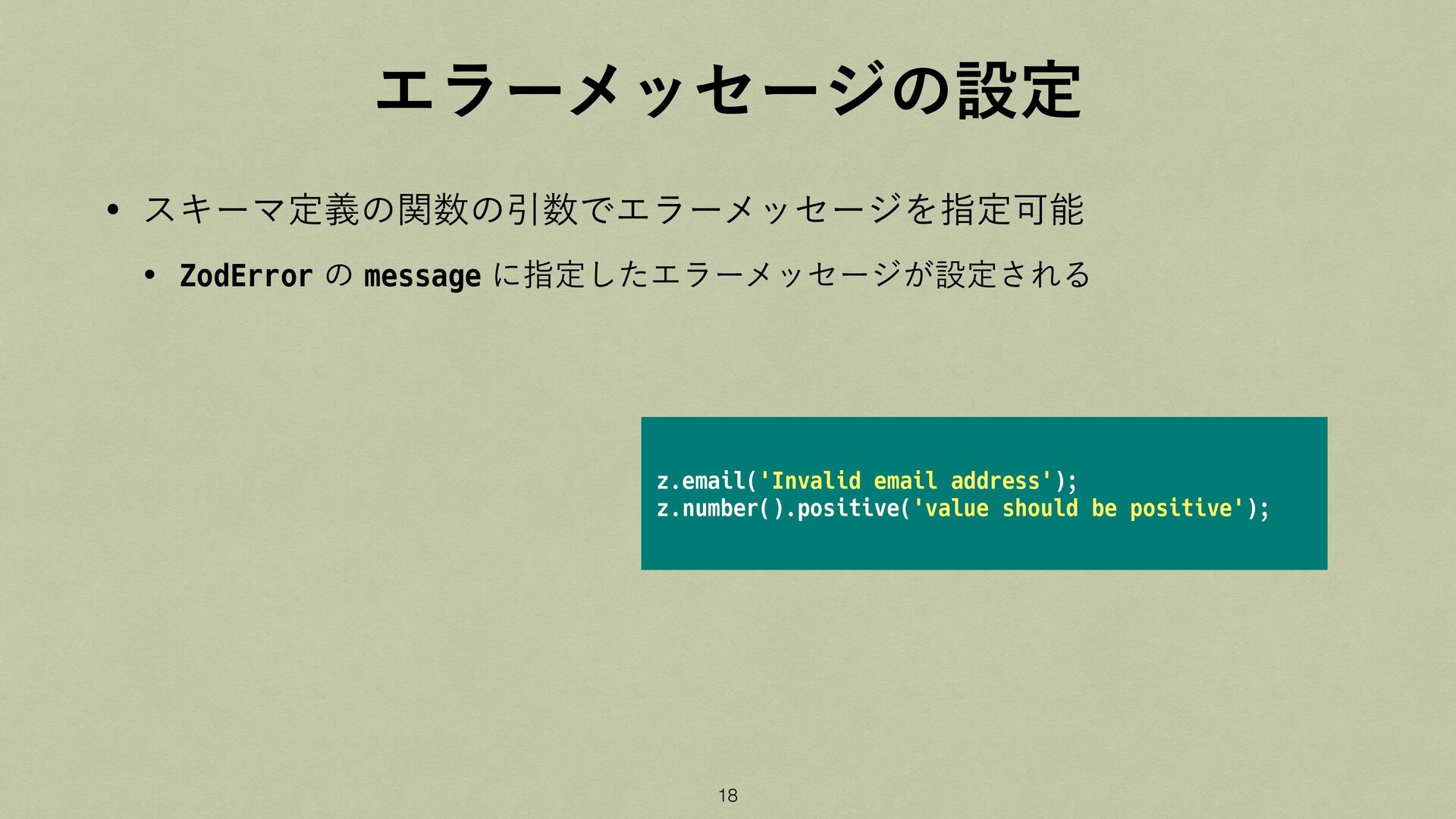 Τϥʔϝοηʔδͷઃఆ w εΩʔϚఆٛͷؔͷҾͰΤϥʔϝοηʔδΛࢦఆՄೳ w ZodErrorͷmessageʹࢦఆͨ͠Τϥʔϝοηʔδ͕ઃఆ͞ΕΔ 18 z.email('Invalid email address'); z.number().positive('value