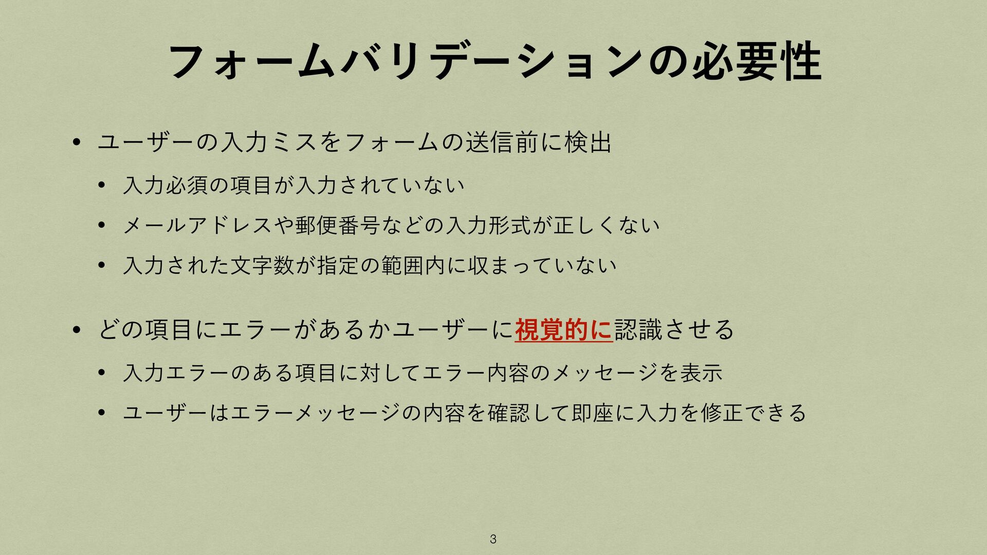 ϑΥʔϜόϦσʔγϣϯͷඞཁੑ w ϢʔβʔͷೖྗϛεΛϑΥʔϜͷૹ৴લʹݕग़ w ೖྗඞਢͷ߲͕ೖྗ͞Ε͍ͯͳ͍ w ϝʔϧΞυϨε༣ศ൪߸ͳͲͷೖྗܗ͕ࣜਖ਼͘͠ͳ͍ w ೖྗ͞Εͨจࣈ͕ࢦఆͷൣғʹऩ·͍ͬͯͳ͍ w