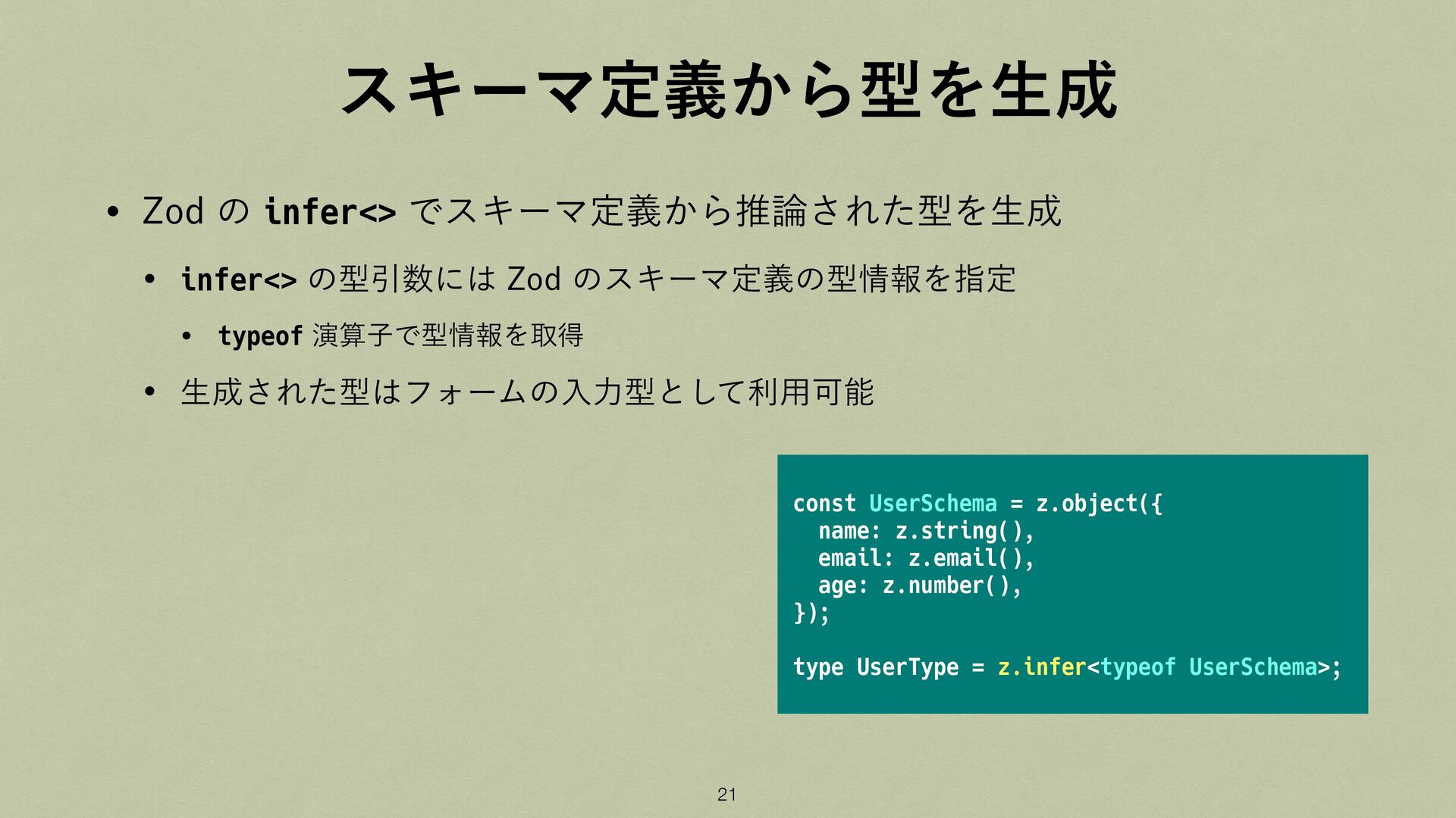 ;PEͷεΩʔϚఆٛʹج͍ͮͯࣗಈతʹόϦσʔγϣϯ͞ΕΔ 22 import { zodResolver } from '@hookform/resolvers/zod'; const { /* 略 */ } = useForm<UserType>({ resolver: zodResolver(UserSchema), });