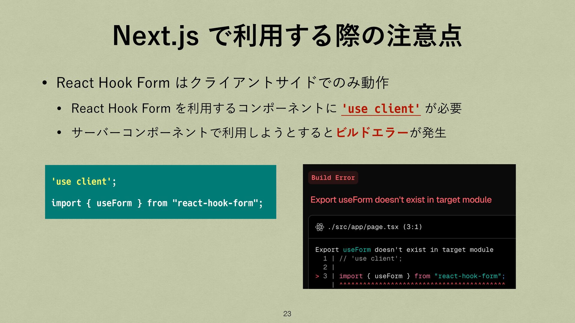 /FYUKTͰར༻͢Δࡍͷҙ w 3FBDU)PPL'PSNΫϥΠΞϯταΠυͰͷΈಈ࡞ w 3FBDU)PPL'PSNΛར༻͢Δίϯϙʔωϯτʹ'use client'͕ඞཁ w αʔόʔίϯϙʔωϯτͰར༻͠Α͏ͱ͢ΔͱϏϧυΤϥʔ͕ൃੜ 23 'use
