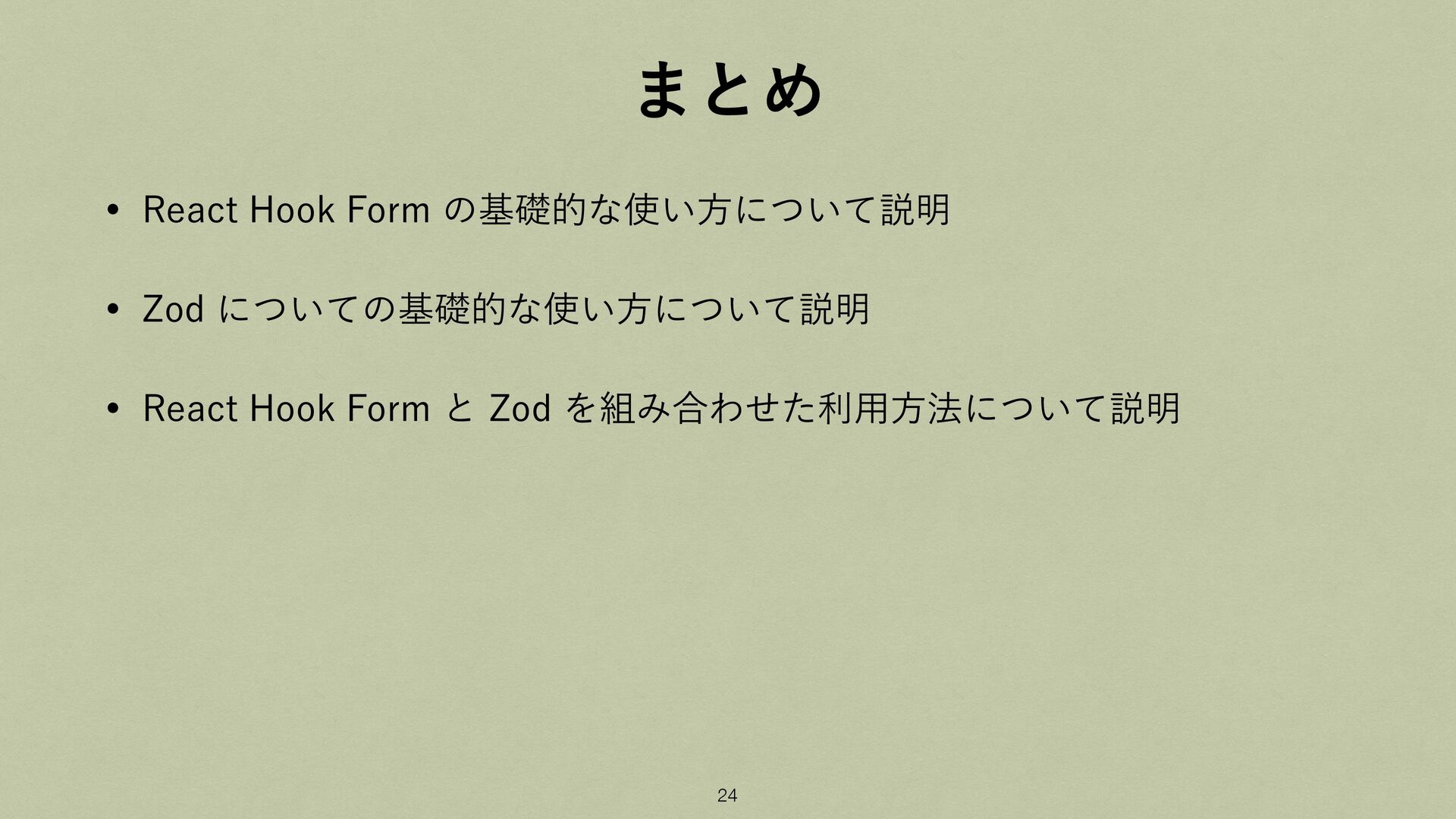 ·ͱΊ w 3FBDU)PPL'PSNͷجૅతͳ͍ํʹ͍ͭͯઆ໌ w ;PEʹ͍ͭͯͷجૅతͳ͍ํʹ͍ͭͯઆ໌ w 3FBDU)PPL'PSNͱ;PEΛΈ߹Θͤͨར༻ํ๏ʹ͍ͭͯઆ໌ 24