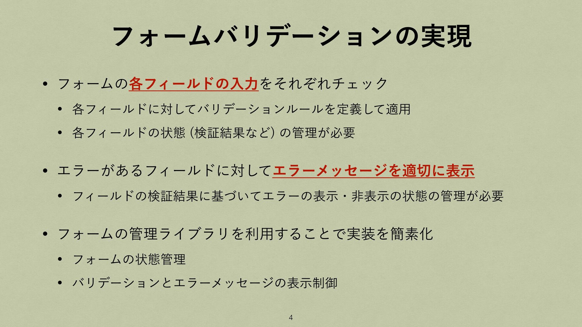 Τϥʔ͕͋ΔϑΟʔϧυʹରͯ͠ΤϥʔϝοηʔδΛదʹදࣔ w ϑΟʔϧυͷݕূ݁Ռʹج͍ͮͯΤϥʔͷදࣔɾඇදࣔͷঢ়ଶͷཧ͕ඞཁ w ϑΥʔϜͷཧϥΠϒϥϦΛར༻͢Δ͜ͱͰ࣮Λ؆ૉԽ w ϑΥʔϜͷঢ়ଶཧ w όϦσʔγϣϯͱΤϥʔϝοηʔδͷද੍ࣔޚ 4